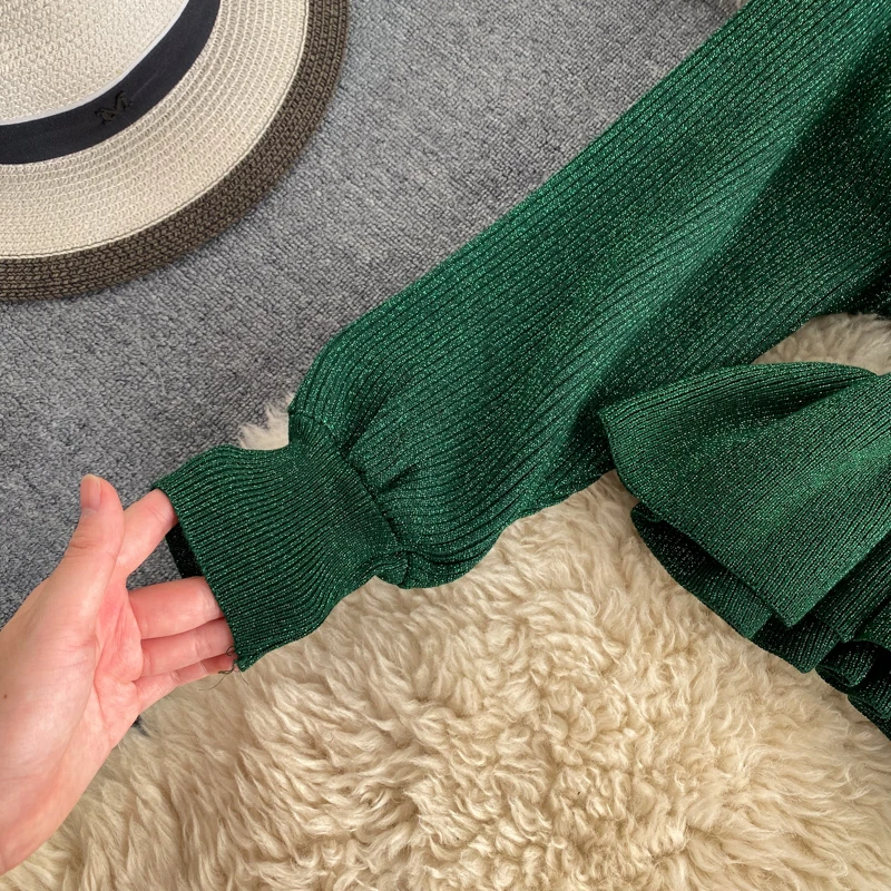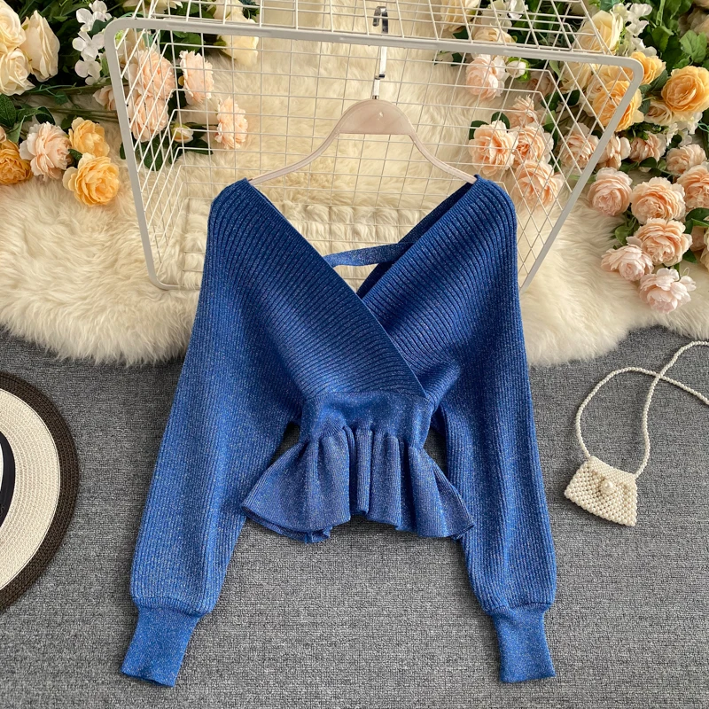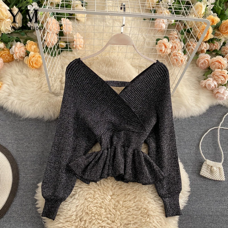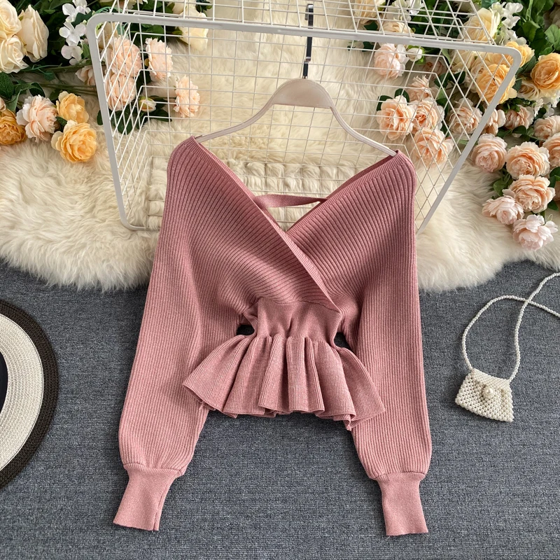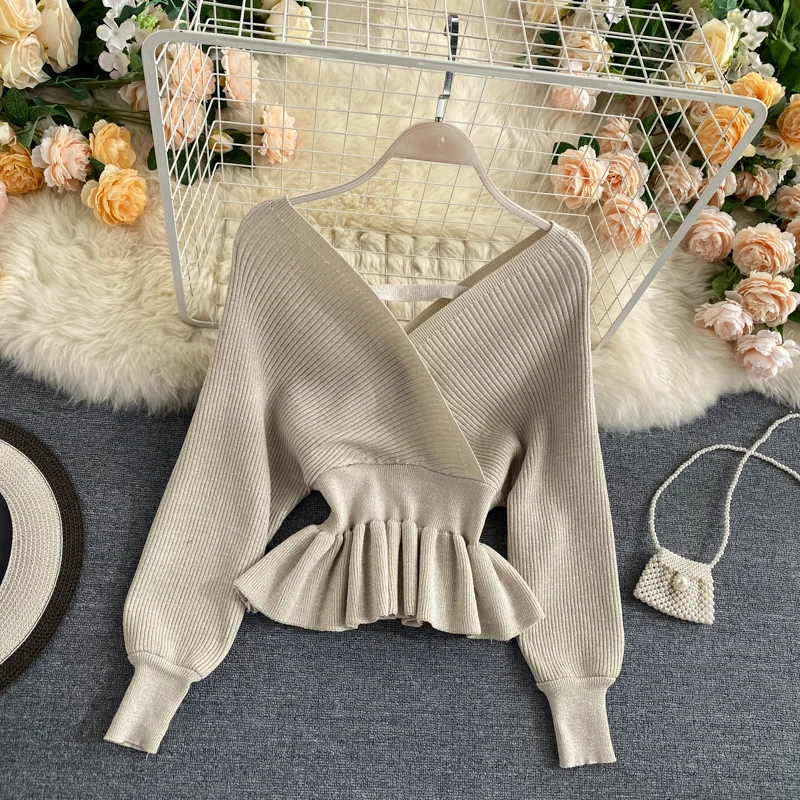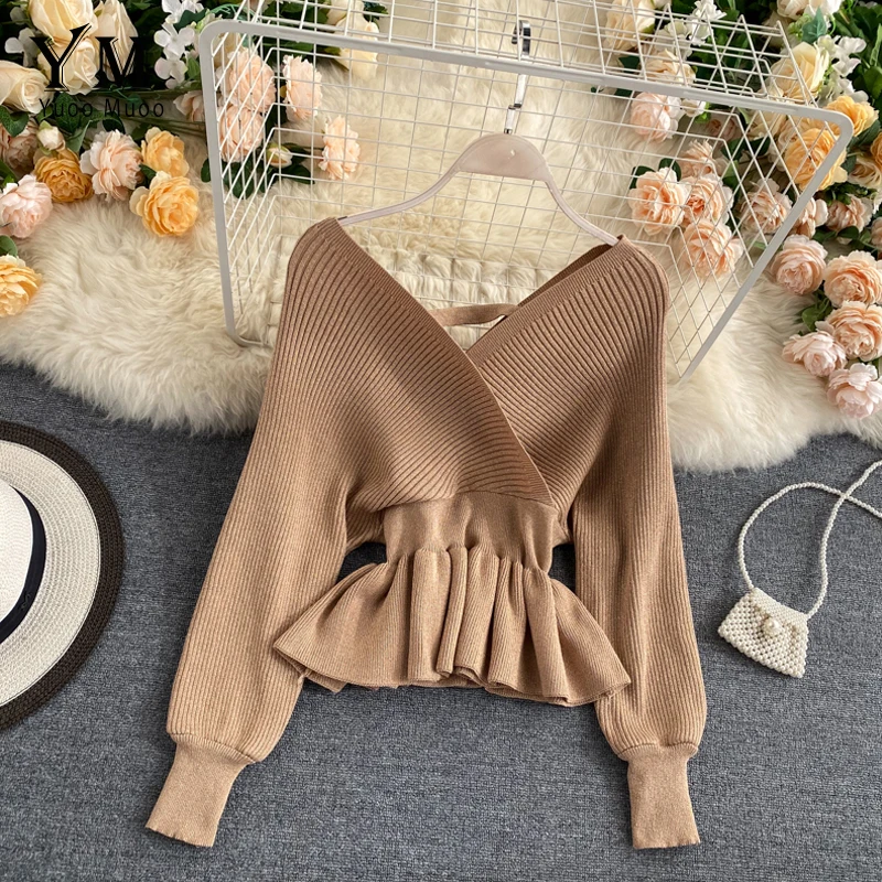YuooMuoo Bling, хорошее качество, плотный осенне-зимний элегантный вязаный пуловер с V-образным вырезом и оборками, свитер, женские топы, рубашка