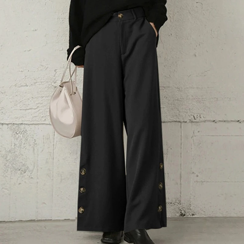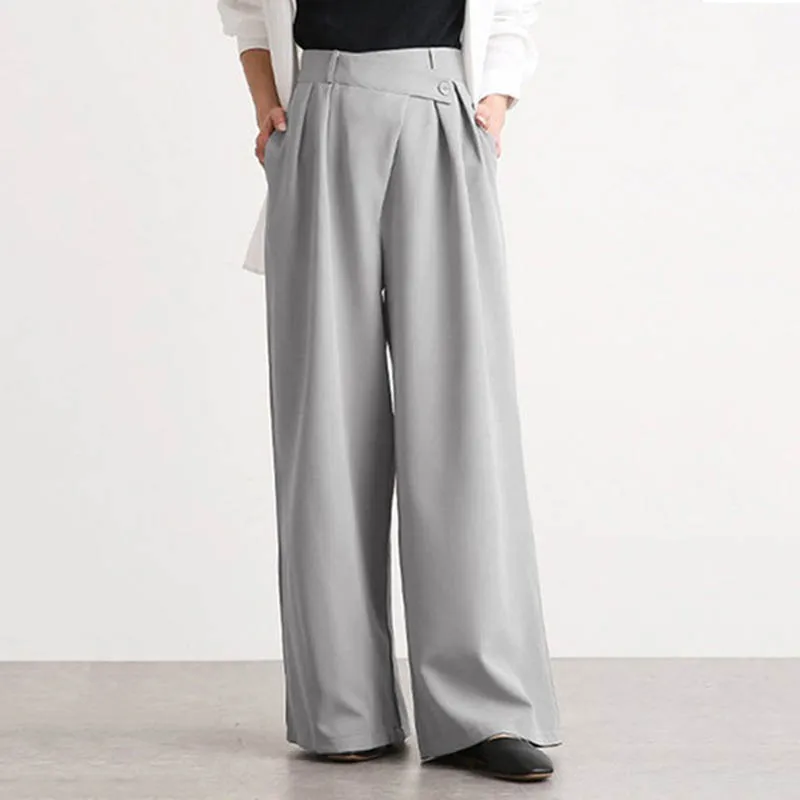 Женские Модные осенние широкие брюки с высокой талией, повседневные однотонные свободные элегантные офисные женские брюки в строгом стиле с пуговицами