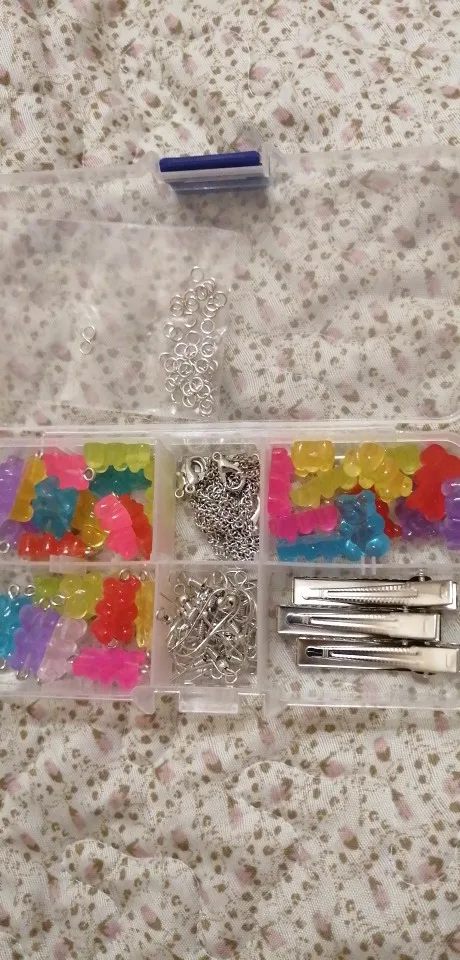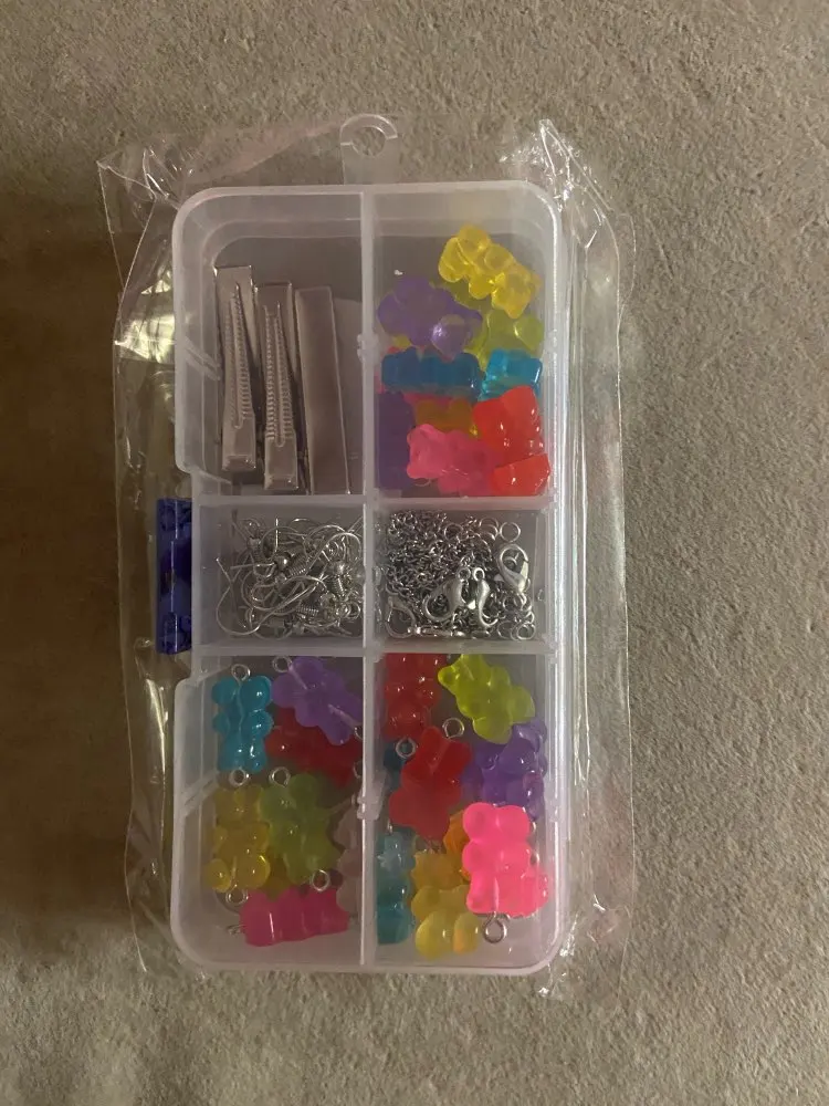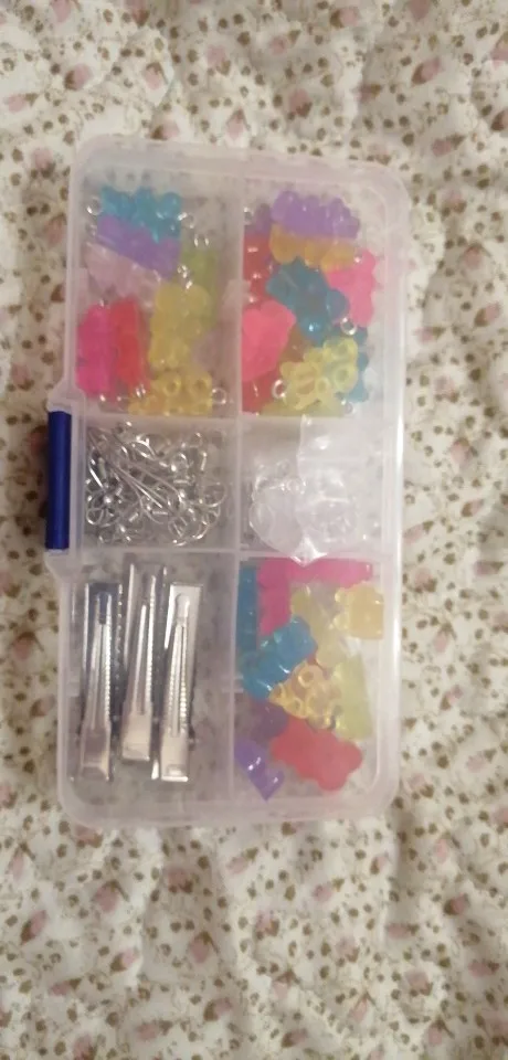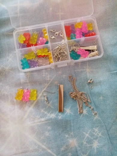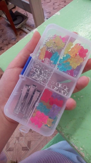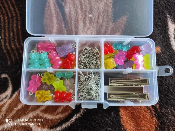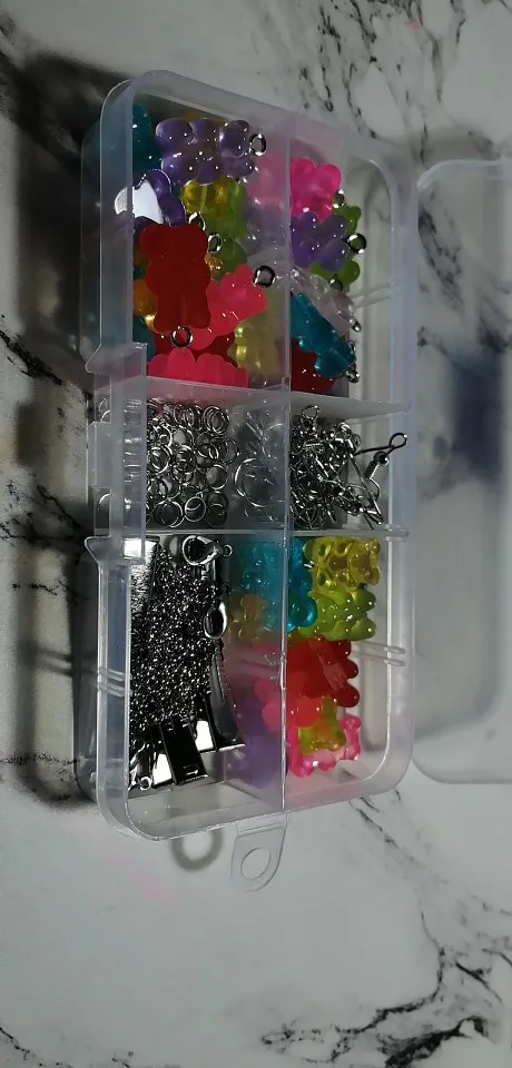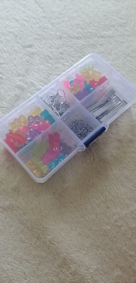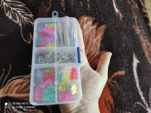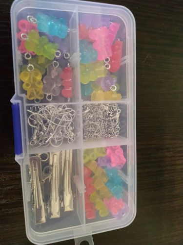Понравился набор детям. Они уже наделали сережек, заколку и цепочку с мишками. Коробочка небольшая.