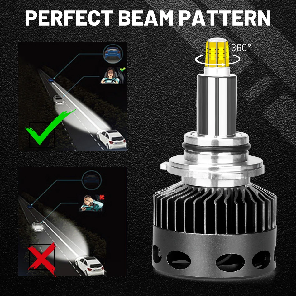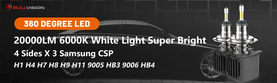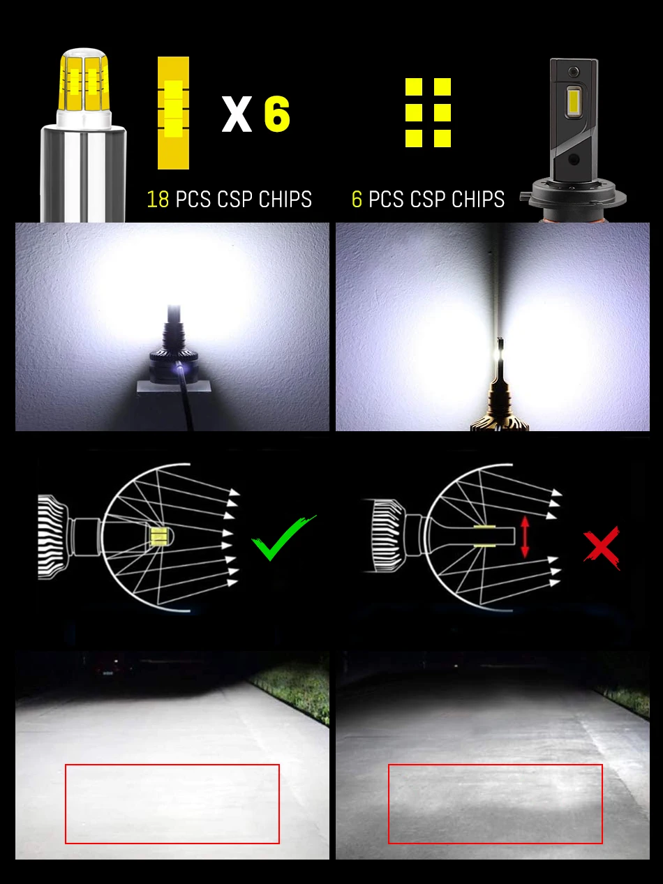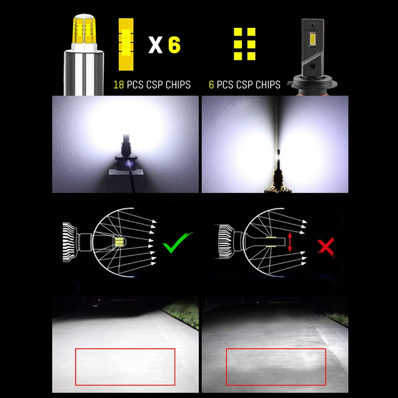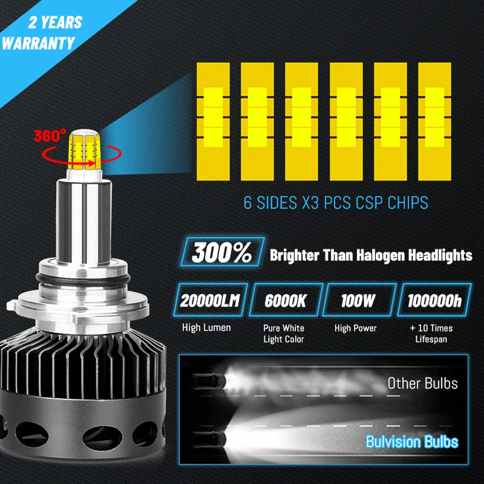 (1) светодиодная фара 200 лм/пара, каждая лампа 10000 лм, супер яркая.(2) одна светильник имеет 6 сторон, 18 кристаллов CSP, освещение на 360 градусов.(3) Этот продукт 6000k, чистый белый свет.(4) Мощность этого продукта составляет 100 Вт/пара, каждая лампа-50 Вт.