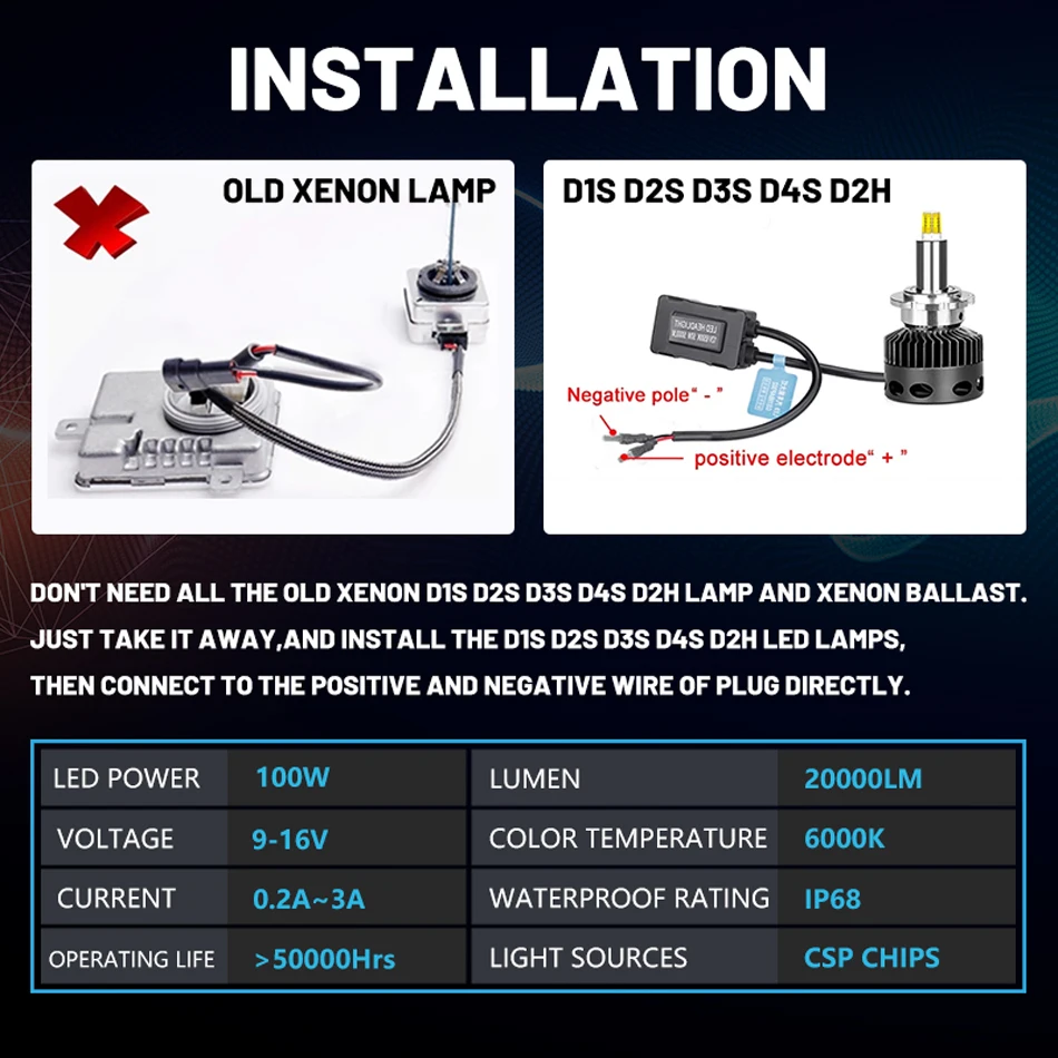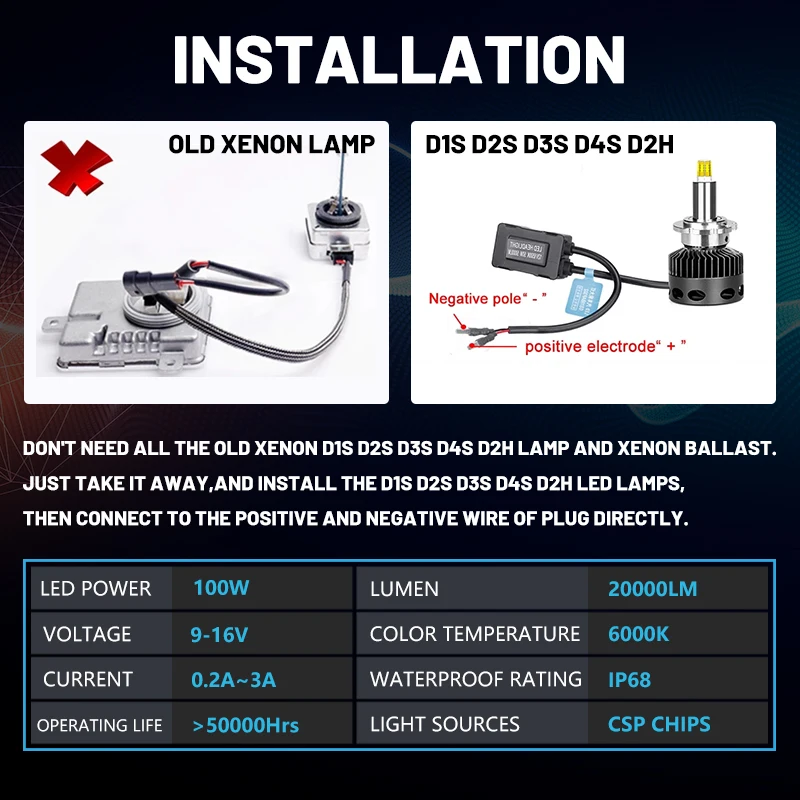 Пожалуйста, установите, как на изображении. Не нужна вся старая ксеноновая лампа D1S D2S D3S D4S D2H и ксеноновый балласт. Просто снимите его и установите лампы D1S D2S D3S D4S или D2H, затем подключите непосредственно к положительному и отрицательному проводу вилки.