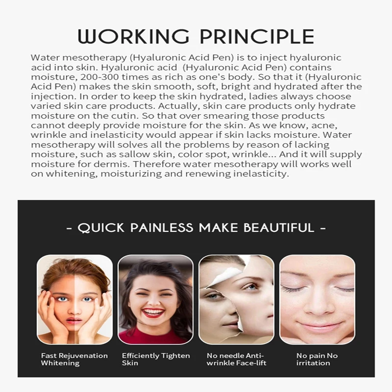 Описание продукта: Тип: ручка с гиалуроновой кислотой Особенности: удаление кровеносных сосудов, омоложение кожи, темные круги, удаление морщин, потеря веса, увлажняющий крем, отбеливание, увлажняющий крем Материал: 316 нержавеющая сталь (Профессиональная Медицинская нержавеющая сталь) Режим работы: распыление высокого давления Глубина впрыска: 6-15 мм Принцип работы: Пружина и поршень, которые позволяют под давлением быстро и равномерно вводить препараты под кожу через отверстие диаметром 0,1 мм, что в два раза меньше толщины иглы для инъекций! С помощью энергии механического действия пружина и специальный поршень в аппарате позволяют под давлением быстро, но аккуратно проталкивать поток лекарств через Микроскопическое отверстие в подкожной ткани. Препараты усваиваются гораздо лучше и быстрее, чем с введением иглы, что было подтверждено в серии исследований и тестов, проводящихся в разных странах мира. Идеальное решение для тех, кто подвержен рубцам и подкожным сгусткам. Преимущества ручки Hyaluron: * Не вызывает болезненных ощущений впрыска топлива * Инъекция без иглы устраняет риск инфекции от иглы * Не оставляет шрамов и проколов на ткани кожи с помощью иглы * Лучшее и быстрое поглощение лекарств * Строго Подкожная инъекция-устраняет риск проникновения препарата в мышцу * Быстро, легко и безопасно * Раздельное и экономичное дозирование препарата Примечание: Если вы не могли раньше использовать гиалуроновые наполнители (или другие косметические средства), вам лучше проконсультироваться с косметологом. Про жидкий Подробная информация о продукте Инструкции по использованию: 1. Очистка: Используйте очищающие средства, чтобы тщательно вымыть лицо 2. Возьмите 2,5 мл жидкости каждой 3 мл бутылки и 5 мл бутылки, а затем Налейте их в 150 мг бутылки для смешивания, И левая жидкость бутылки 3 мл и бутылки 5 мл не нужна 3. Комбинированная ручка с гиалуроновой кислотой для работы, следуйте инструкциям ручки, чтобы соединить с ампулой и иглой для шприца (если эти инструменты были использованы раньше, пожалуйста, сделайте их дезинфицированными при использовании) 4. Наконец, используя ампулу и шприц иглу для извлечения смешанного раствора, а затем удалите иглу шприца и поместите ампулу на ручку гиалуроновой кислоты для инъекций Примечание: 1. Не возмещайте в тот день 2. Если вы принимаете аспирин или другие похожие антикоагулянтные препараты, перестаньте использовать их в течение нескольких дней перед инъекцией 3. Капилляры под глазами относительно богаты, и синяки, скорее всего, будут иметь место во время эксплуатации, что является нормальным феноменом и не повлияет на эффект или не вызовет побочных эффектов 4. Разные люди будут показывать различные феномены после использования. Красные пятна или небольшие капли крови появятся на коже, что является нормальным и выцветает через несколько дней 5. Не используйте мазь, уход за кожей или косметику после завершения этой операции, и не подвергайте себя воздействию солнца в течение длительного времени