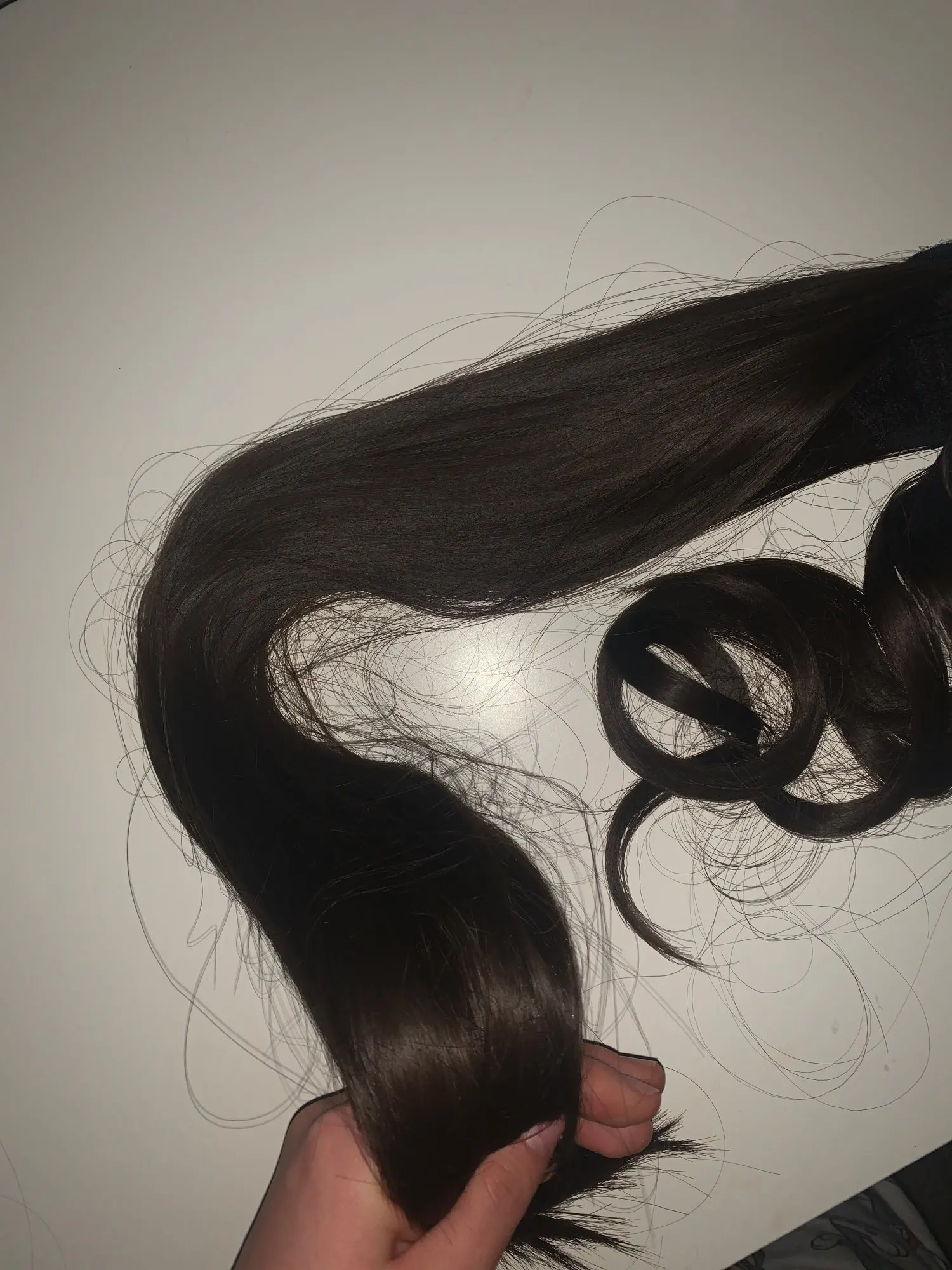 Хвост очень классный и густой , 81см . Качественно сделан. От родных волос по цвету не отличается. Цвет выбрала-dark brown. При покупке данного аксессуара помните, что ваша маленькая женская «хитрость» должна быть незаметной и по внешнему виду ничем не отличаться от натуральных волос. У меня это получилось. Оттенок точь-в-точь! По качеству волос максимально похож на натуральный, так же путается, пушится при расчесывании. В комплекте идёт резиночка и 2 невидимки. Делаем тугой хвост на макушке, за него цепляются металлические зубчики и прядкой волос закручиваем вокруг резинки. У кого короткие волосы, можно просунуть свой хвост в центре, и тогда будет вообще замечательно! В итоге не видно ничего, кроме волос. Прядку можно фиксировать шпилькой, но у меня все и так держится. Продавец быстро отправил заказ. Упаковано-отлично! Трек номер отслеживался. Я очень довольна качеством продукта, ценой, видом! Рекомендую!