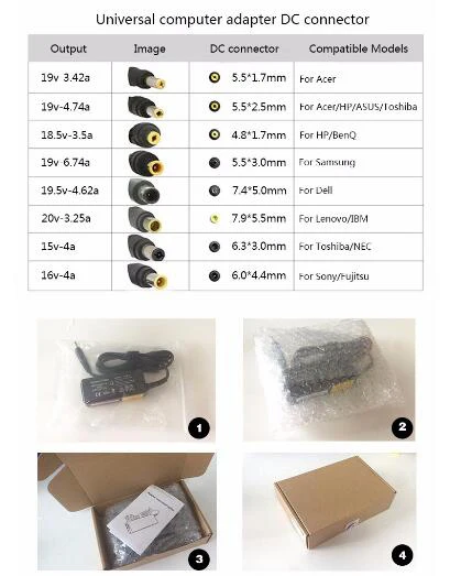 Шаг 1. Проверьте входные данные на вашем ноутбуке или на выходе адаптера.Вы найдете данные о напряжении и токе.Такие как 20V 3.25A, 19V 3.42A, 19V 2.37A ....Шаг 2. Проверьте размер подключения.Диаметр * диаметр lnnerТакие как 5,5*2,5 мм, 4,0*1,7 мм, 4,0*1,35 мм ....Если вы все еще не понимаете, пожалуйста, обратитесь к нам за помощью!
