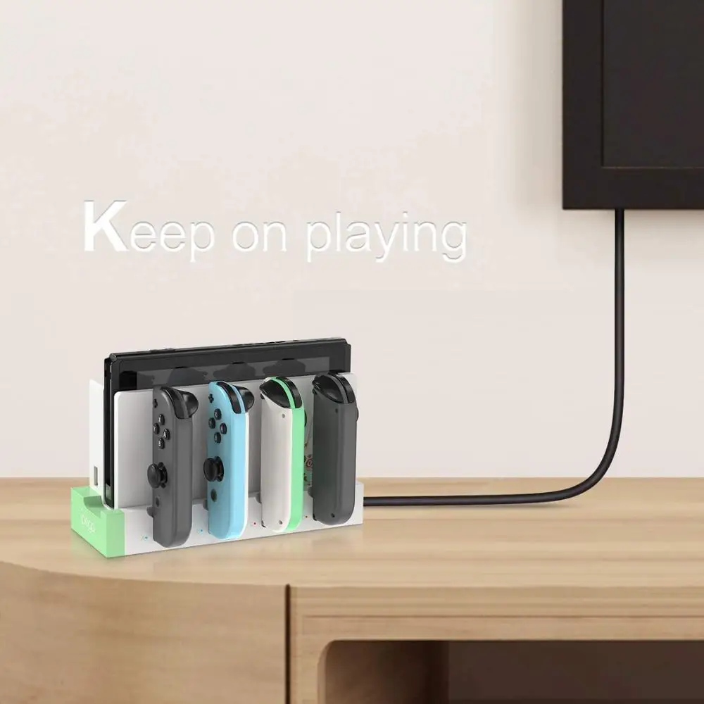 Удобство и надежность-Подключите зарядную док-станцию JoyCons к док-станции переключателя и используйте питание, поддерживая одновременную зарядку 4 контроллеров Joycon, чтобы сэкономить ваше время. Идеально подходит для Nintendo Switch Animal Crossing fans Безопасная Подставка для хранения-Поддерживайте аксессуары для Nintendo Switch, организованные и аккуратные! Лента на стороне зарядного устройства JoyCons может быть отключена, чтобы прикрепить к док-станции, что помогает им более тесно сочетаться Расширенный порт-Оснащен разъемом USB 2,0 female. Он использует usb-порт на боковой стороне док-станции, но также имеет USB на самом продукте для использования, так что он не отнимает никаких функций Компактный дизайн-Эта зарядная док-станция является легкой и компактной. Легко носить с собой в любом месте. Веселитесь дома или на ходу с семьей и друзьями Светодиодный индикатор-Отдельный индикатор зарядки на базе поможет вам определить, заряжаются ли пульты joy con с помощью быстрого взгляда. При полной зарядке свет переходит от красного к синемуПосылка включает в себя: