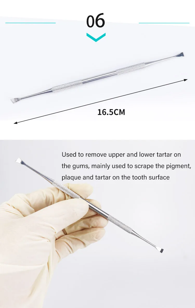 Цвет: серебристыйМатериал: Механическая нержавеющая стальРазмер: как показано на фотографияхКоличество: 6 шт./партияКомплектация: 1 набор из комплект стоматологических инструментовОсобенности:◆ Нескользящая ручка для лучшего захвата.◆ Многоразовые после высокотемпературной дезинфекции.◆ Налет и средства для удаления зубного камня-Зубной налет состоит из невидимых масс вредных микробов, которые живут во рту и прилипают к зубам по линии десны◆ Преимущества по сравнению с обычным уходом за зубами-не требует зубной пасты или полоскания рта◆ Помогает предотвратить запах во рту-когда зубной налет остается между зубами.Полезные советы:◆ Пожалуйста, очистите инструменты до и после каждого использования◆ Будьте осторожны при использовании зубных щупов◆ Тщательно высушите инструменты перед тем, как хранить их в чехле◆ Держите подальше от детей и не делитесь с другими людьми или животнымиПожалуйста, обратите внимание:◆ Погрешность в 0-1 см может возникнуть из-за измерений вручную, пожалуйста, примите во внимание.◆ Различия в цвете могут возникнуть из-за разных настроек монитора.◆ Мы предоставляем вам лучшие товары и услуги. Если у вас возникли проблемы, сообщите нам, и мы решим их как можно скорее. Большое спасибо.