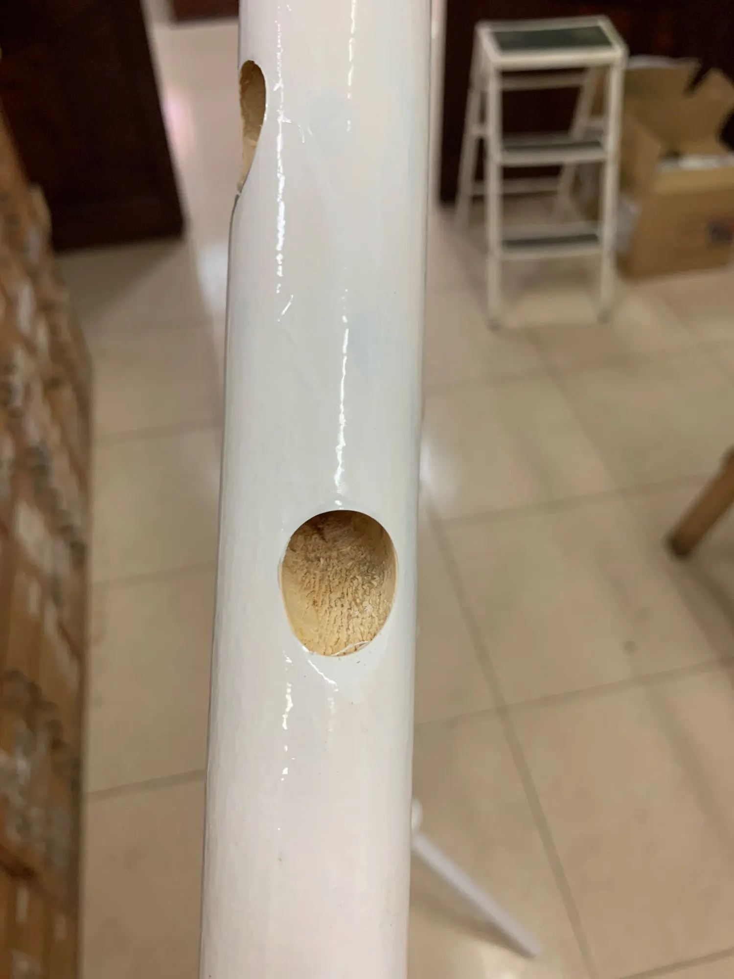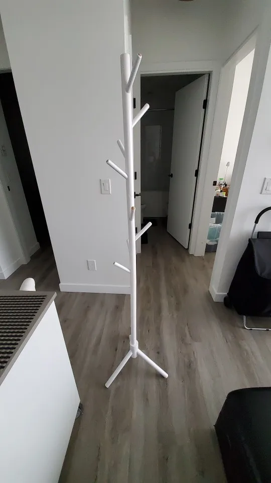 el perchero no está pintado está recubierto de un papel blanco muy mal pegado, no cubre toda la superficie de la madera, los agujeros están mal alineados por lo que queda torcido. muy mala calidad aconsejo no comprar.