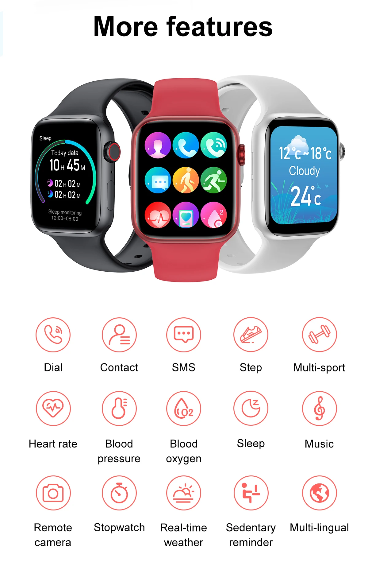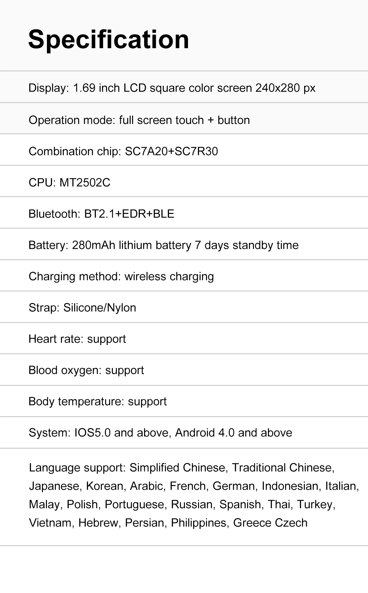 Совместимость с Android и iOS Система Мобильный телефон требует IOS 5,0 и выше или Android 4,0 и выше Вызов Bluetooth После мобильный телефон и подключения приложения часов можно совершать звонки по Bluetooth и звонки непосредственно на стороне часов. Язык Японский, корейский, арабский, французский, немецкий, индонезийский, итальянский, малайский, польский, португальский, русский, испанский, тайский, турецкий, Вьетнам, иврит, персидский, Филиппины, Греция, чехия, Украина Сделай Сам циферблат После того, как телефон и приложение для часов подключены, изображение на телефоне можно установить как шаблон экрана часов. IP67 водонепроницаемый Водонепроницаемые часы поддерживают только ежедневную ручную стирку, потливость или брызги дождя и т. д. снимите часы во время плавания, дайвинга или купания. Напоминание о сообщении Поддержка уведомления о сообщениях о программном обеспечении связи, таком как SMS, Facebook, Twitter, line, WhatsApp, Skype, Instagram, Kakao Talk и т. д. Дополнительные функции -- Мониторинг нескольких режимов упражнений -- Управление музыкой по Bluetooth -- Мониторинг сердечного ритма -- Мониторинг уровня кислорода в крови -- Контроль температуры тела -- Мониторинг сна -- Будильник -- Календарь -- Калькулятор -- Удаленная камера -- Уведомление о погоде