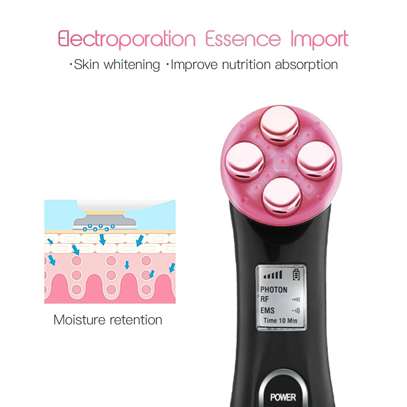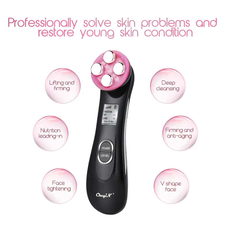 1, ток EMS может активировать клетки и создать новый коллаген, наконец, сделать вашу кожу более твердой, более энергичной и упругой, улучшить мелкие морщинки на поверхности кожи.2. Технология электропорации может создать разрыв между клетками в течение короткого времени, что делает кожу поглощать больше средств по уходу за кожей.3. Радиочастота RF может снять боль в мышцах и усталость кожи, облегчить напряжение кожи, уменьшить покраснение, отек и боль, и сопротивляться повторному росту акне.4. Светодиодные лампы имеют розовый, желтый, зеленый, синий и розовый свет вспышки шесть режимов. Этот светодиодный свет может отбеливать кожу, осветлять тон кожи, способствует регенерации коллагена, подавляет чрезмерную продукцию меланина и сужающихся пор и т. Д.5. Продукт имеет 5 уровней интенсивности на выбор, вы можете настроить его в соответствии с типом кожи и личными предпочтениями.6. Этот косметический инструмент не токсичен, не имеет бокового эффекта, безболезнен, подходит для всех типов кожи.7. Встроенная светодиодная лампа не генерирует тепло.