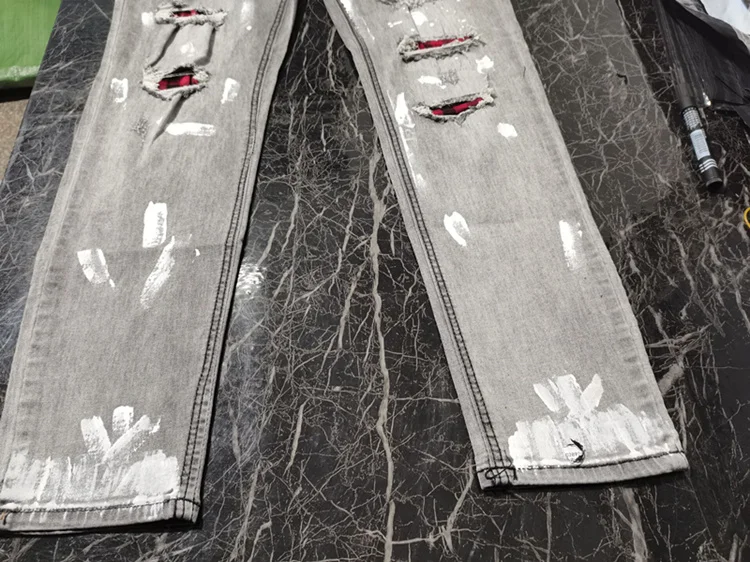 Мужские Узкие рваные джинсы, клетчатые джинсовые брюки в стиле пэчв...
