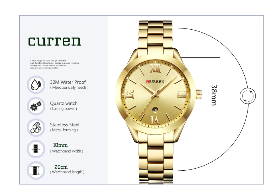 Женские Водонепроницаемые кварцевые часы CURREN, золотистые японски...