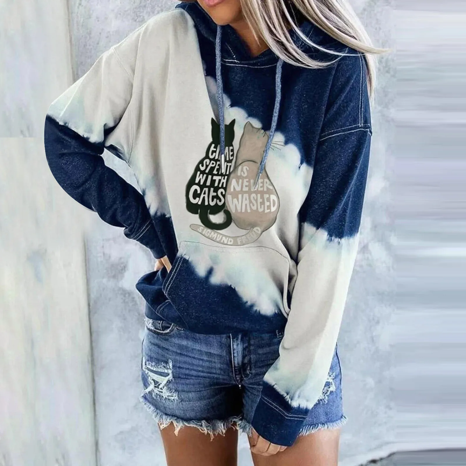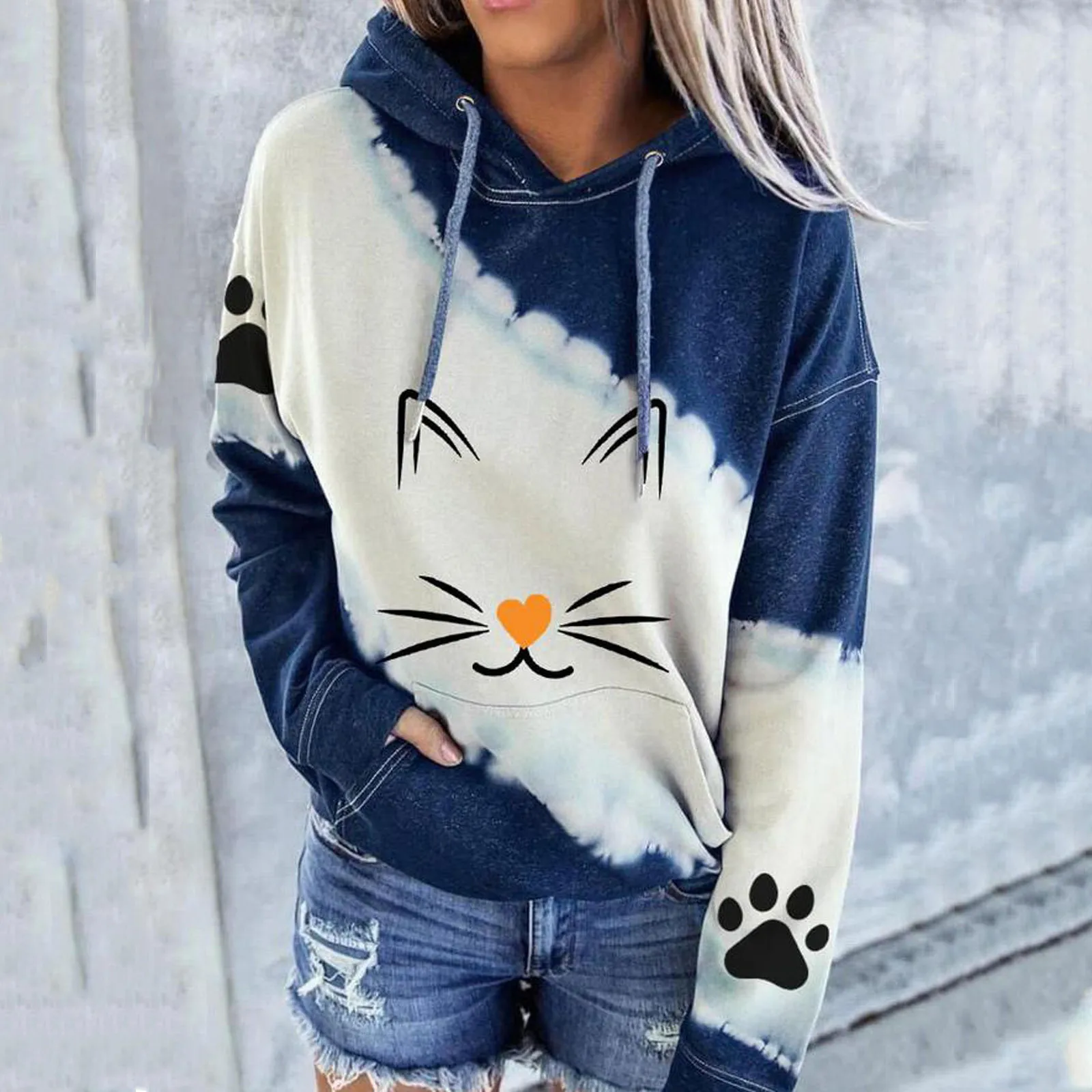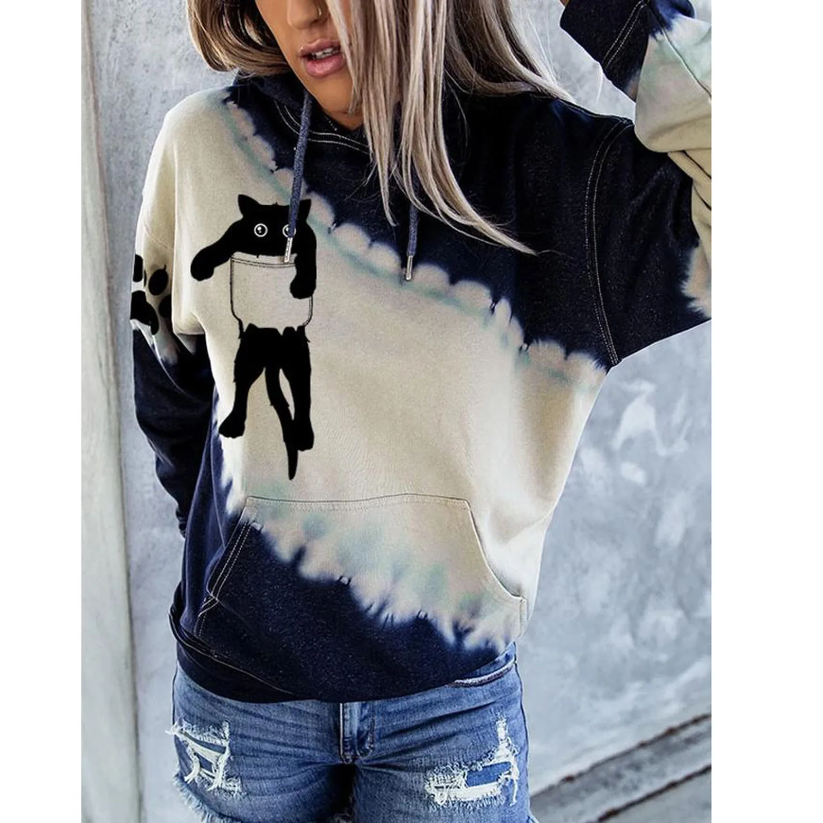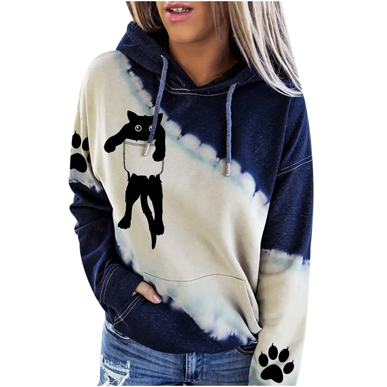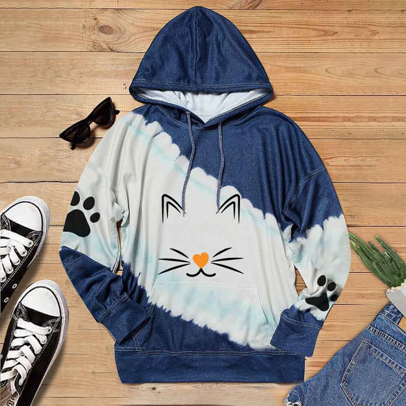 Женский свитер с длинным рукавом 4 #, с карманами и принтом цветных блоков кошек, топ с капюшоном, женский свитер, женские свитера на Рождество 2020, женские свитера