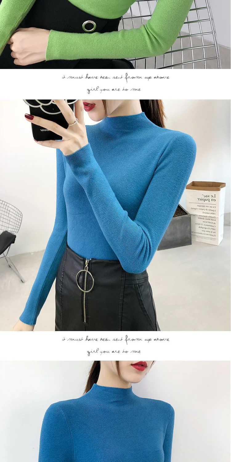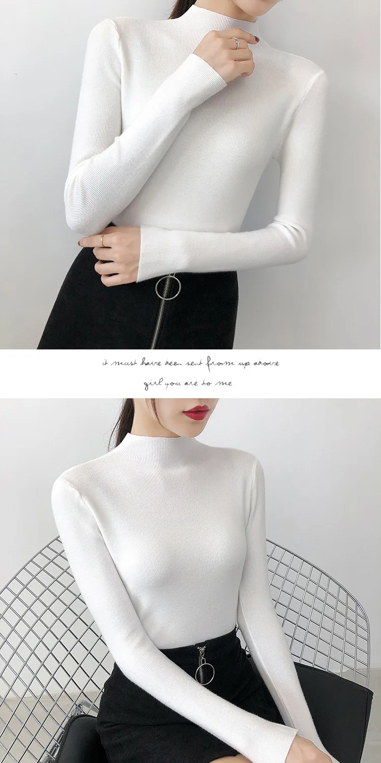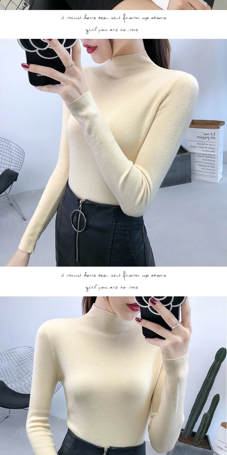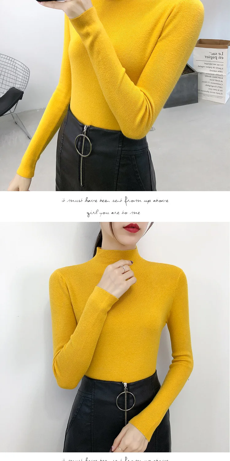 Женский трикотажный пуловер, повседневный облегающий джемпер с длинным рукавом, Осень-зима, однотонная водолазка с коротким воротом