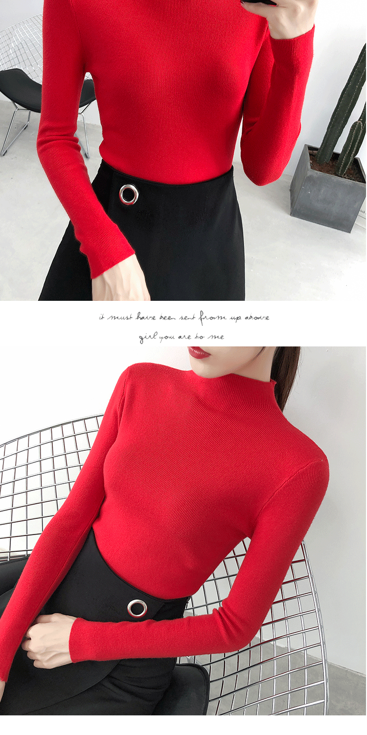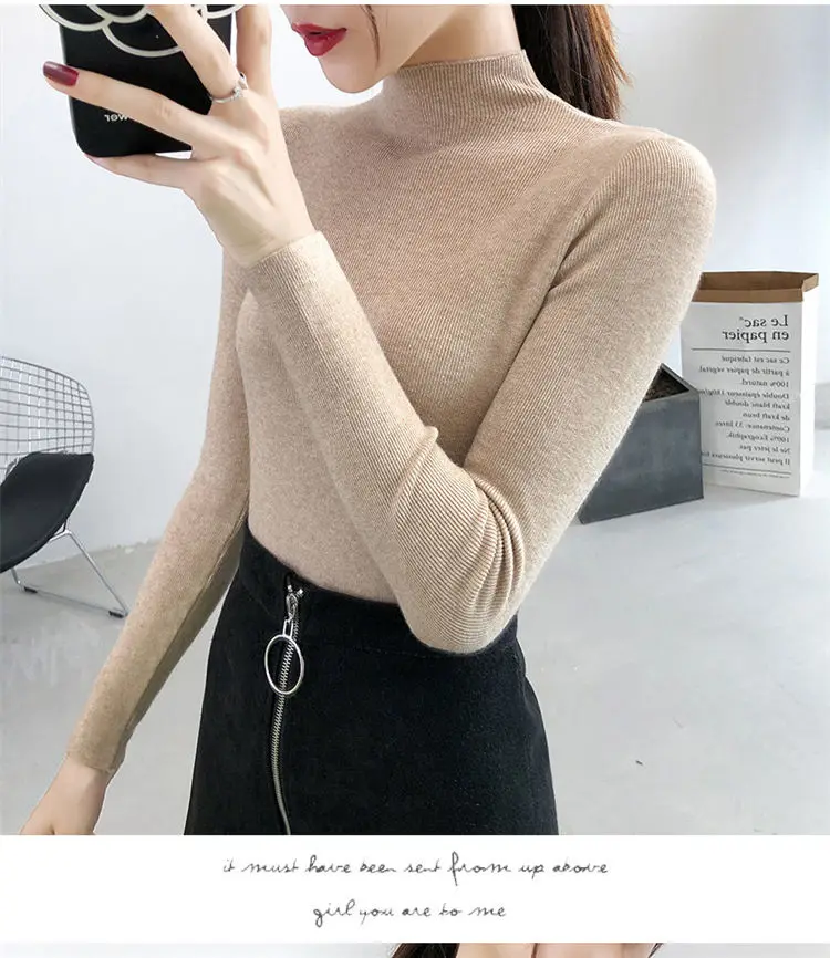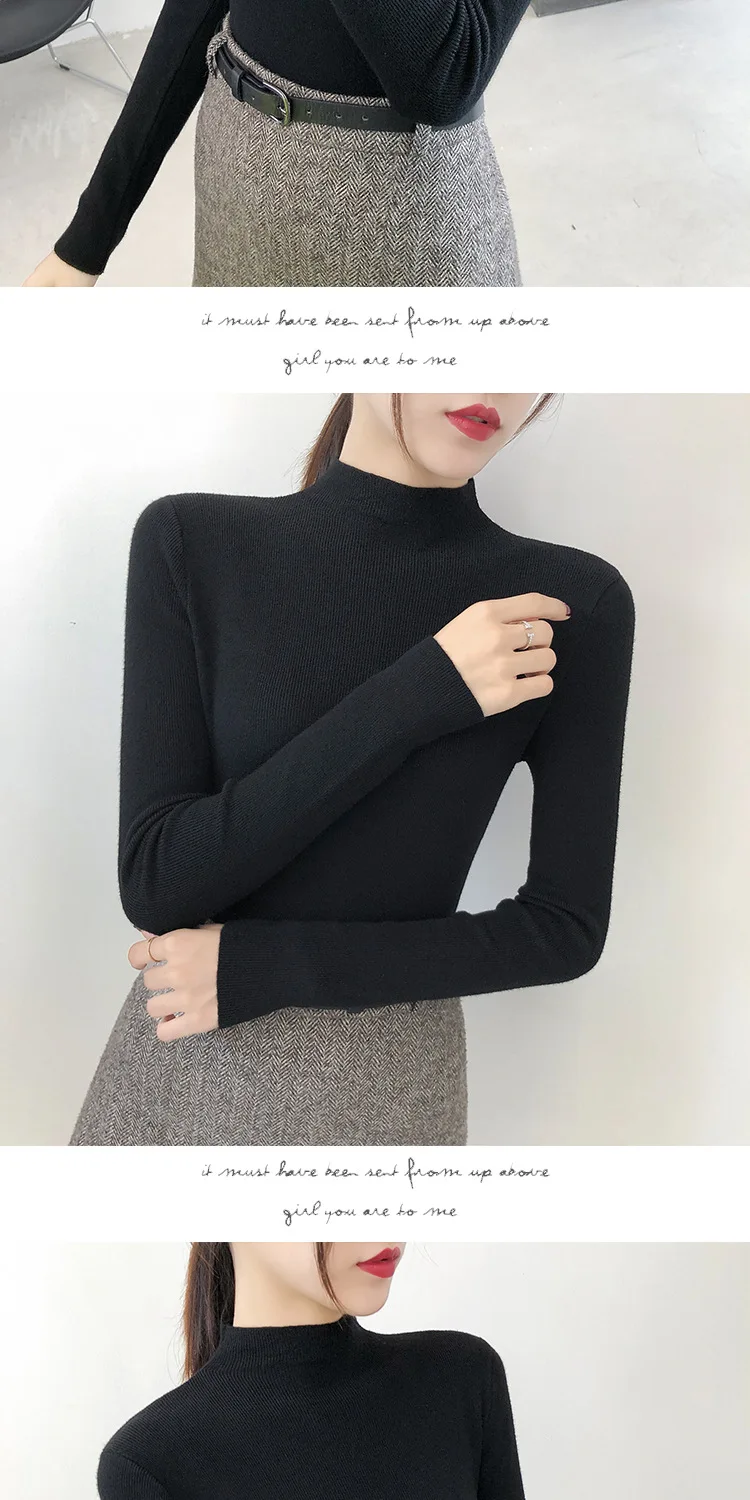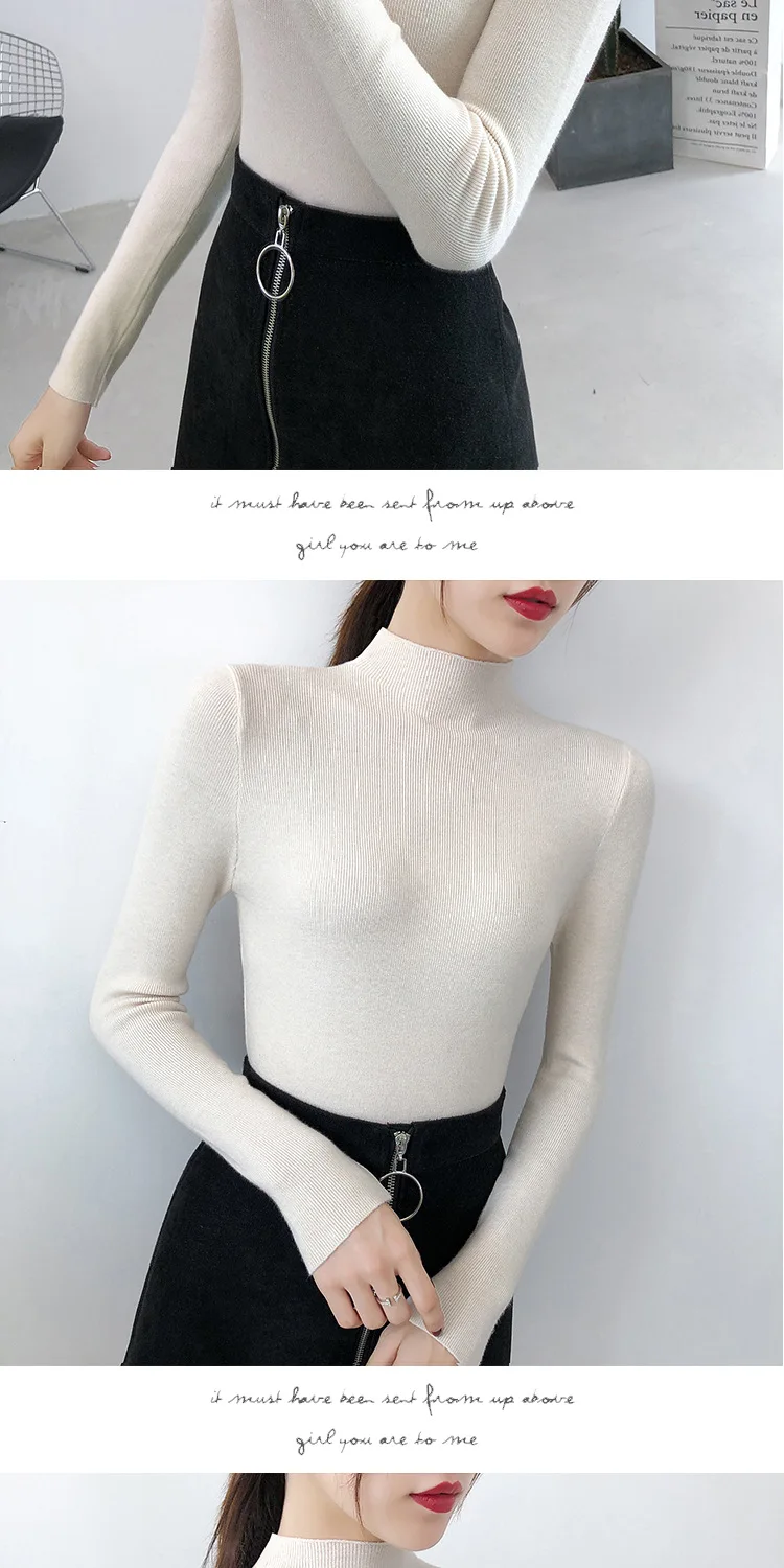 Женский трикотажный пуловер, повседневный облегающий джемпер с длинным рукавом, Осень-зима, однотонная водолазка с коротким воротом