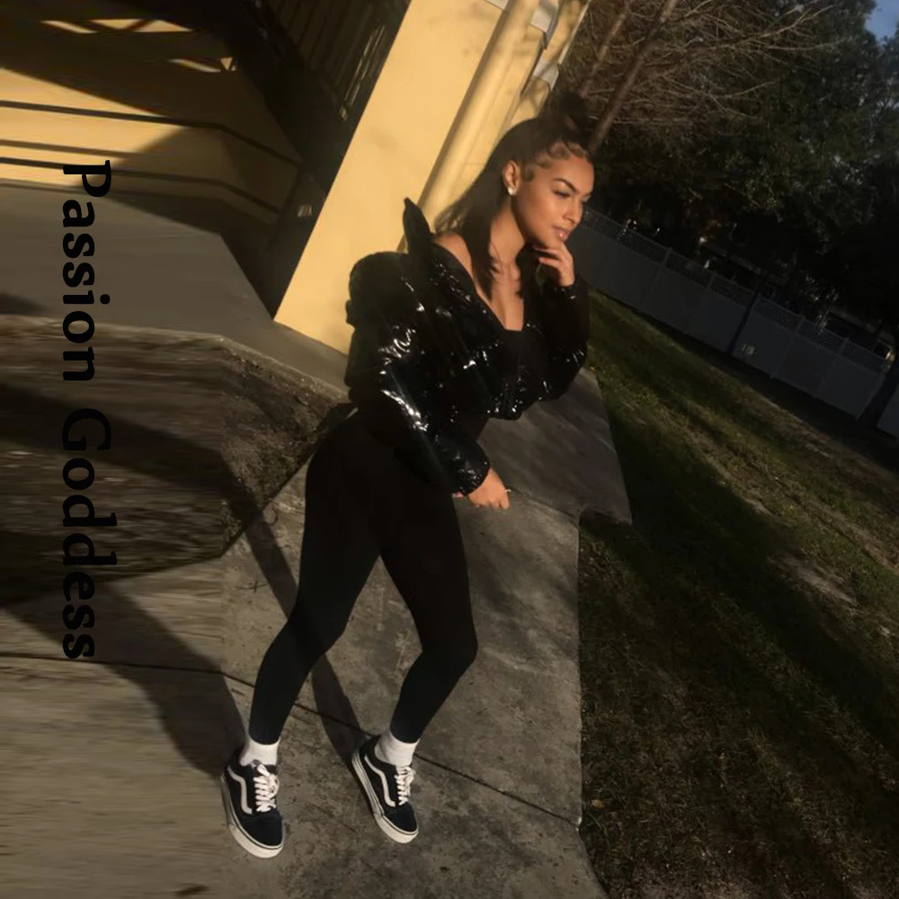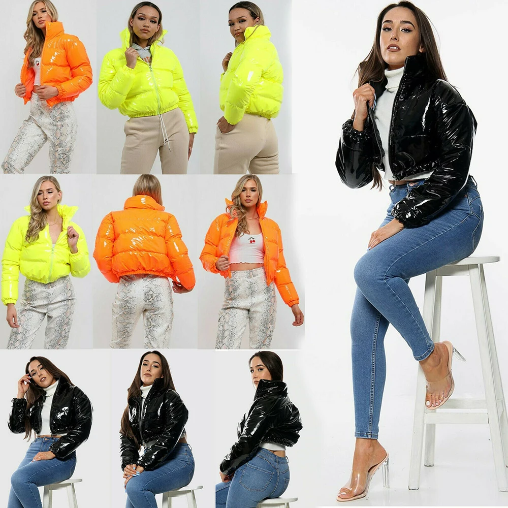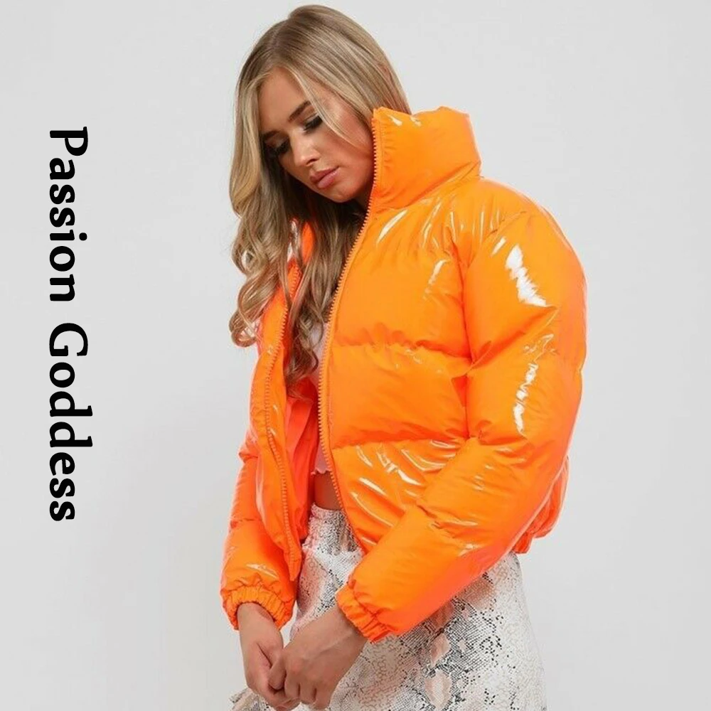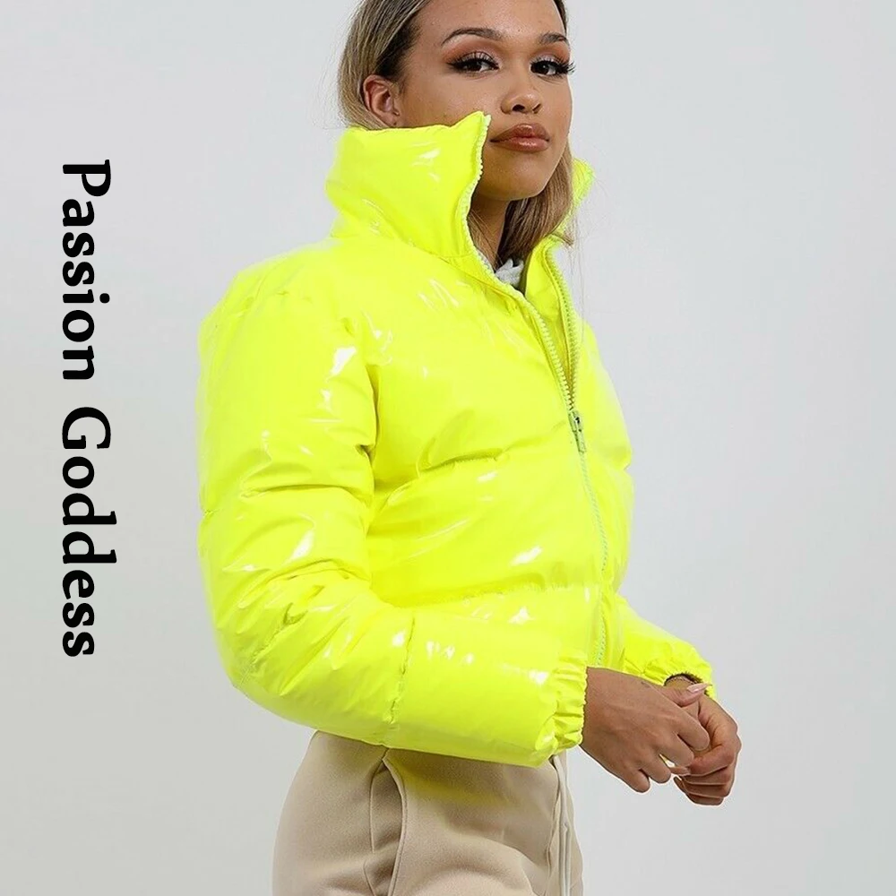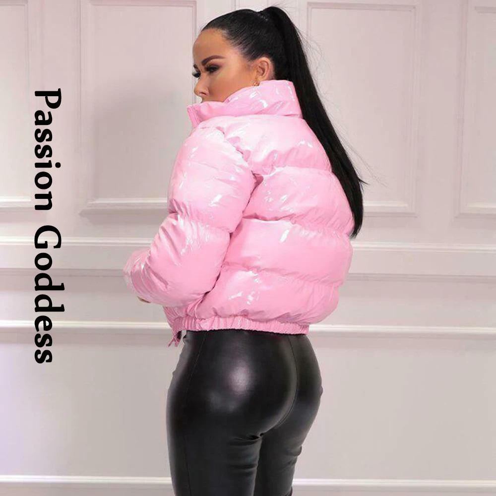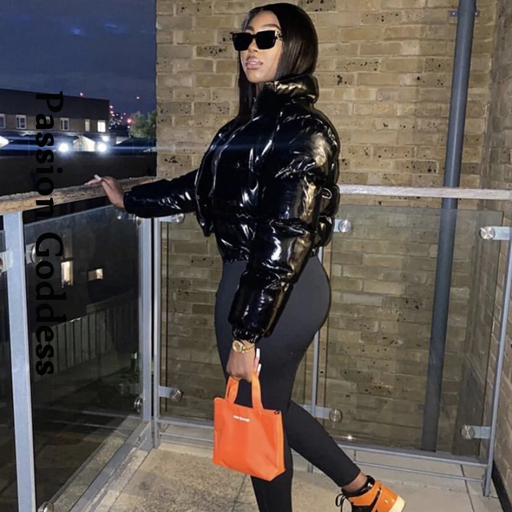 Куртка-пуховик Женская однотонная, кожаная, на молнии, с воротником-стойкой