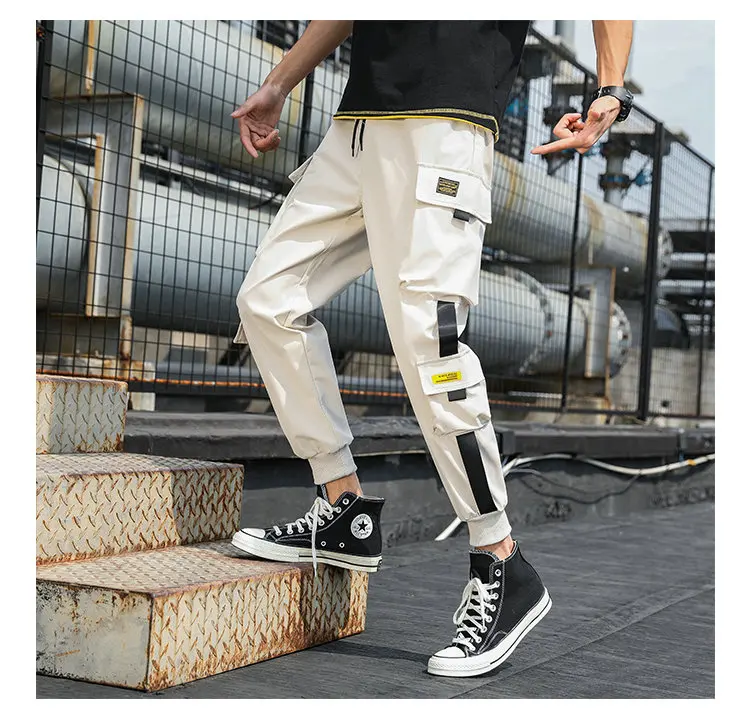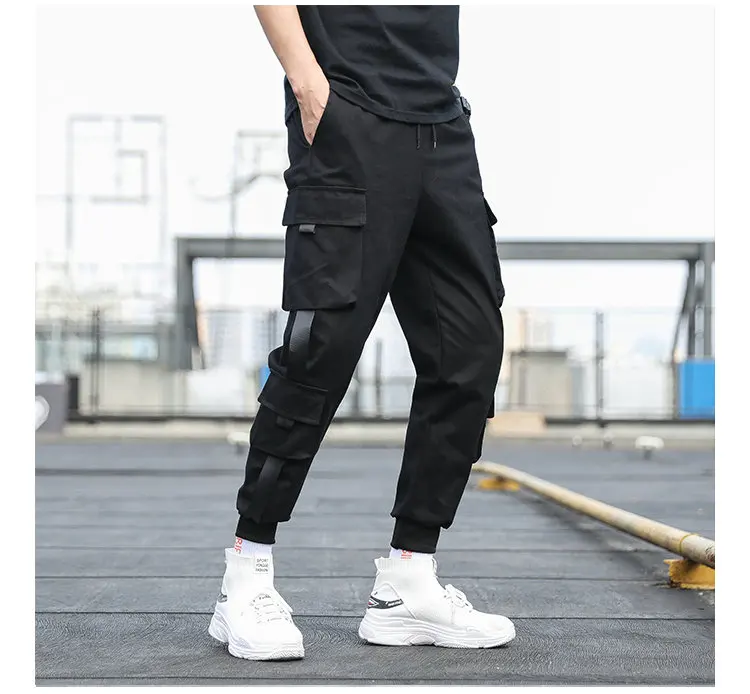 Мужские брюки-карго с боковыми карманами, черные повседневные мужские джоггеры с лентами 2020 в стиле хип-хоп, брюки, модная повседневная Уличная одежда