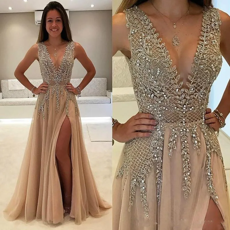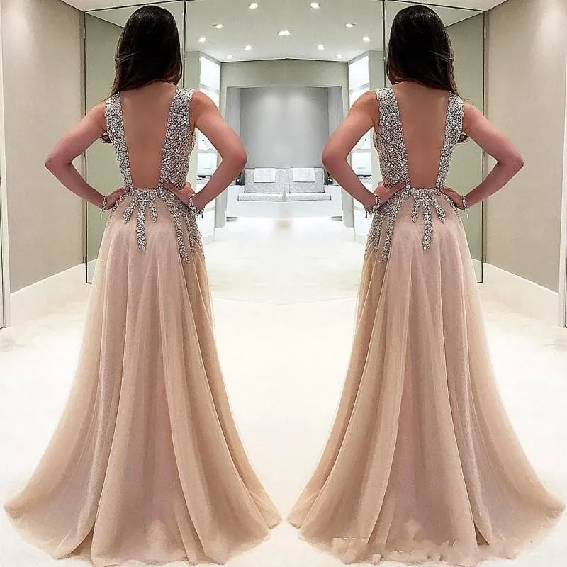 Роскошные Beadings кристаллы блестками Глубокий v-образный вырез Выпускные вечерние платья Длинные Кружева Аппликации открытая спина Формальные платья Вечерние платья