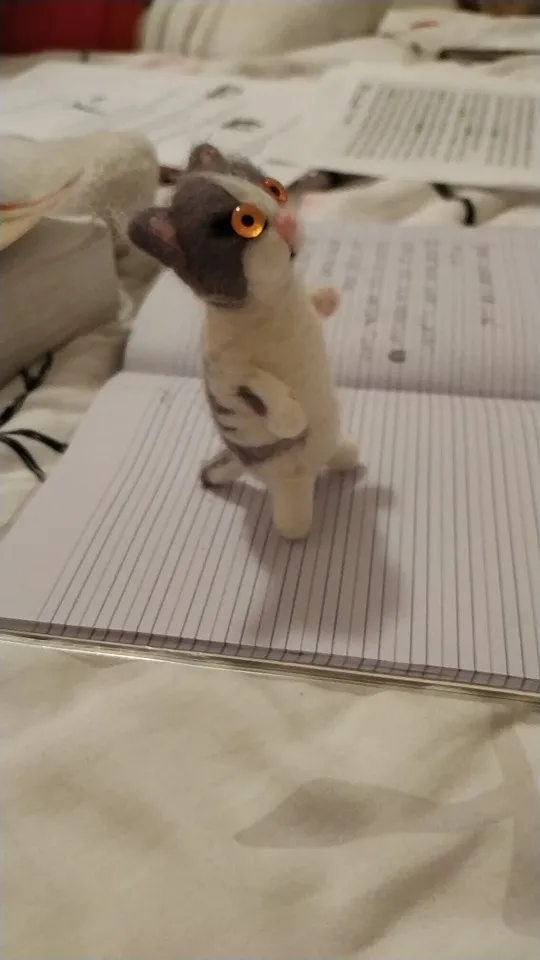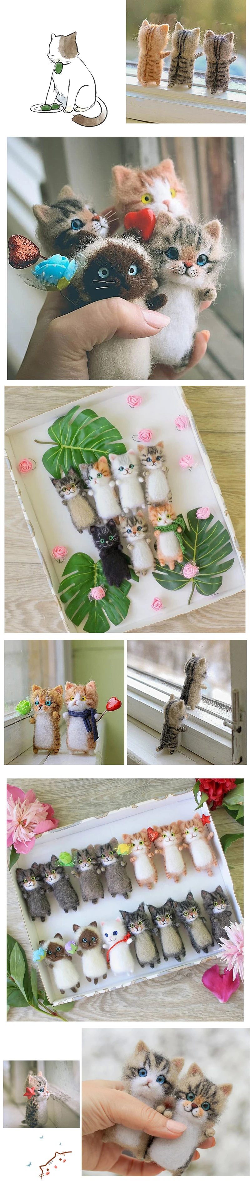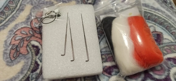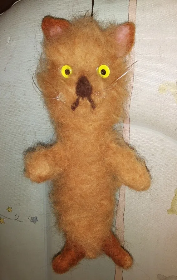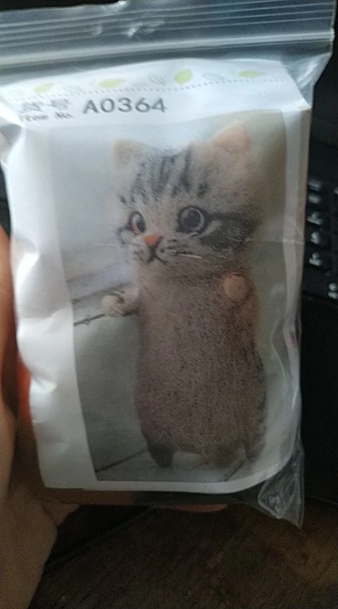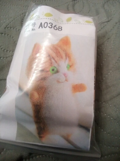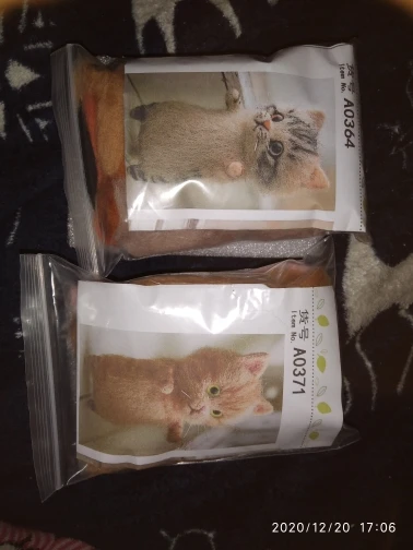 Приехали быстро, на 2 комплекта продавец положил 2 пары игл, при валянии первого маленького котика сломала 2. как сделаю, дополню отзыв. У этого кота больше шерсти в 2 раза, цветка и усов в комплекте нету, иглы воткнуты в подложку, пушистая палочка для хвоста. Видюхи по производству нет, так что сделаю по наитию :3