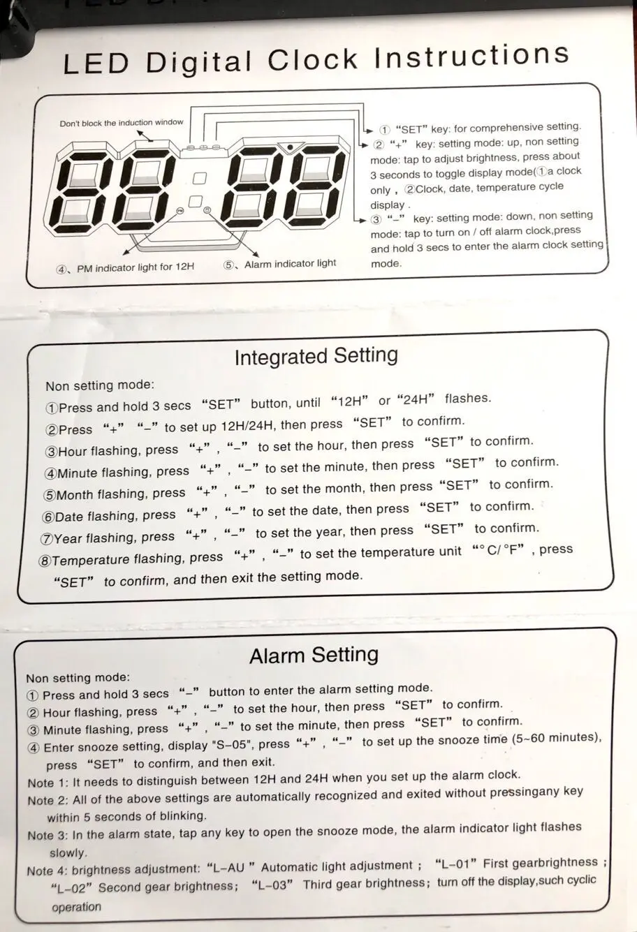 Описание функции 1. Led time display2.12/24 часа 3. Будильник/ночное белье 4. Температурный дисплей (℃/Фаренгейт) 5. Диапазон температур: 0 ℃ ~ 50 ℃ 6. Три уровня яркости 7. Три функциональных кнопки (режим, будильник, набор) 8. Функция памяти времени (аккумулятор CR2032 * 1 для временной памяти) 9. Потребляемая мощность: 1 аккумулятор CR2032 (входит в комплект) usb-кабель для зарядки (прилагается) 10. Когда аккумулятор заряжается или питается от USB кабеля, светодиодный светильник up.11. Когда кабель USB используется, светодиодный индикатор всегда будет включен, и время, температура и календарь будут отображаться циркулярно. 12. Ночной режим означает, что светодиодный дисплей автоматически регулирует яркость ночью. [Настройка уровня яркости] a. Три уровня яркости. По умолчанию значение brightc. Нажмите кнопку «+», чтобы переключиться на тусклый уровень.