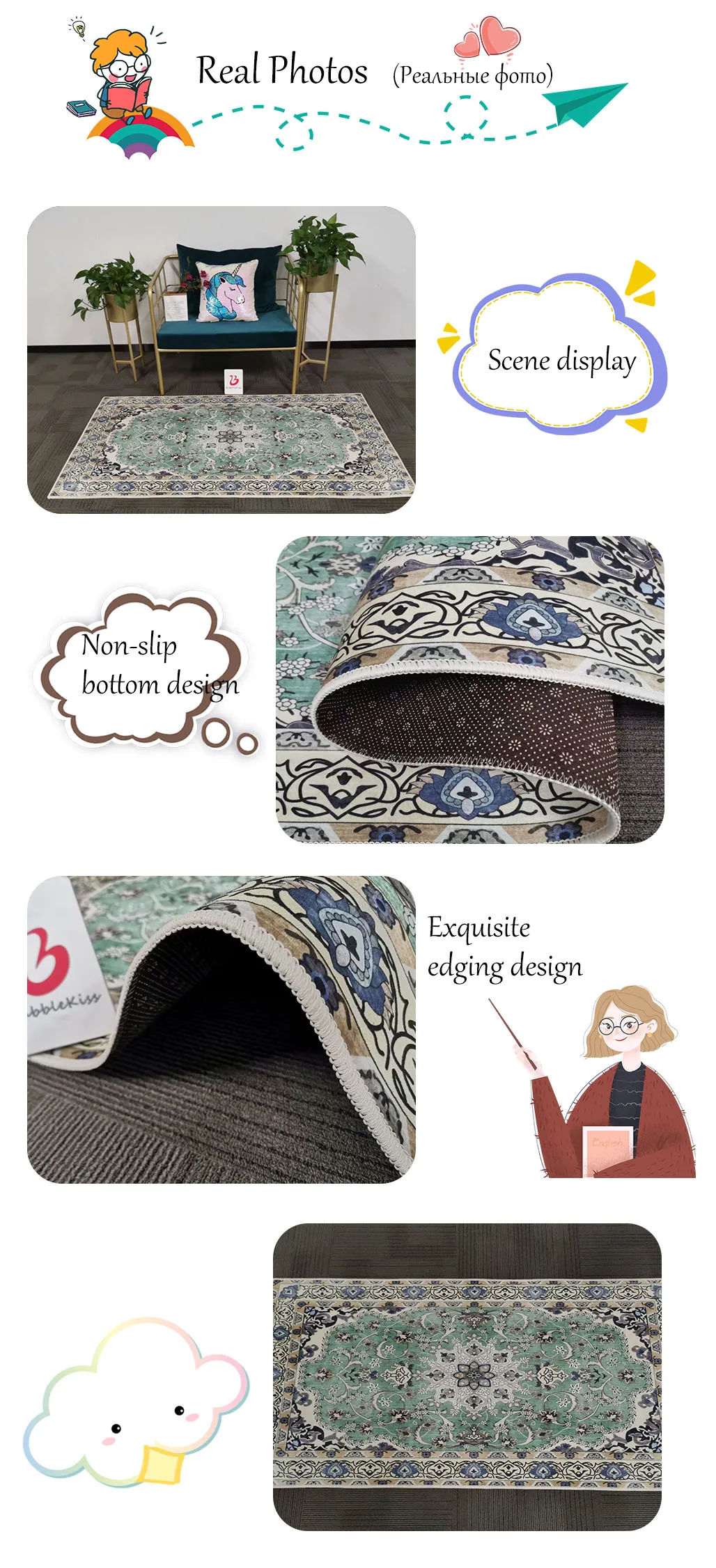 В: есть ли у вас действительно фото? О: Да, если вы хотите просмотреть реальные фотографии, пожалуйста, свяжитесь с нами! Мы предоставим вам позже. В: Можно ли сделать заказ? Ответ: Да, если вам нужна Настройка, пожалуйста, свяжитесь со службой поддержки клиентов В: это не скользит? О: Да, нижняя часть ковра-Нескользящая пластиковая подошва В: если вам это не нравится, как мне его вернуть? Ответ: если покупатель возвращает товар в течение 15 дней после получения товара по какой-либо причине, мы вернем покупателю деньги. Однако покупатель должен оплатить стоимость обратной доставки и убедиться, что возвращенный товар остается в первоначальном состоянии. В: какая логистика используется для доставки? О: товары отправляются по стандарту AliExpress, Почта Китая airmail, AliExpress экспресс-почтой, ePacket и прибывают в большинство стран в течение 15-35 рабочих дней. Время доставки зависит от пункта назначения и других факторов, это может занять до 60 рабочих дней. Если вы хотите получить продукцию быстрее, пожалуйста, свяжитесь с нами, чтобы оплатить дополнительную стоимость доставки, мы можем предоставить вам следующие более быстрые и дешевые способы доставки: UPS, DHL, Fedex, TNT, DEPX, EMS. Таким образом, вы можете получить товар в течение 5-7 рабочих дней.