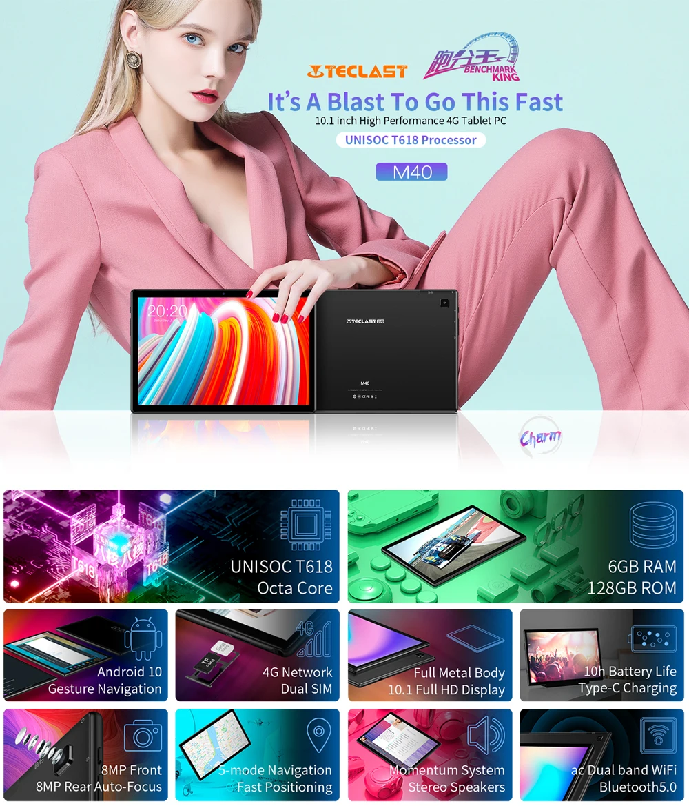 Планшет Teclast M40, экран 10,1 дюйма, 6 ГБ ОЗУ, 128 Гб ПЗУ, 1920x1200, 4G сеть, UNISOC T618 восемь ядер, планшетный ПК, Android 10, двойной Wi-Fi, Type-C