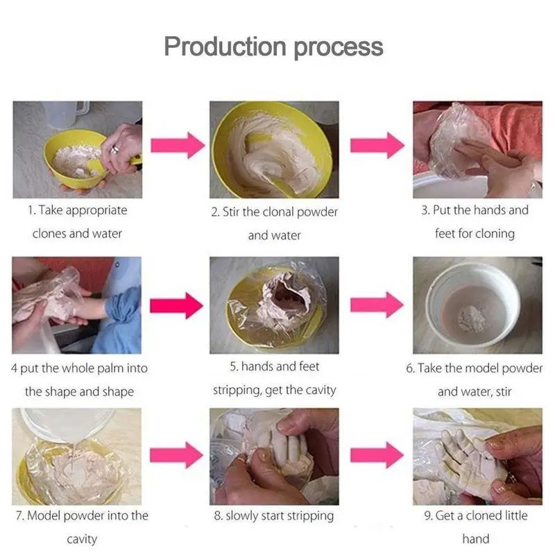 Особенности:Сохраните каждую драгоценную деталь вашего ребенка.Воспроизводите трехмерную форму руки или ноги вашего ребенка с точными деталями.Уникальная резиновая форма захватывает каждую тонкую линию и отпечаток пальца, даже если ребенок шевелится. Безопасность в использовании, нетоксичный, не аллергенный, 100% биоразлагаемый. Веселое и запоминающееся занятие для семьи и друзей, чтобы прослужить всю жизнь!Описание: Возьмите порошок клона 50 граммов, добавьте 50 граммов объема воды в смесь, быстрое смешивание, затем клонируйте порошок и смесь воды в фиолетовую пасту.Размешать его около 1 минуты или около того, фиолетовый постепенно отошел, немедленно Положите маленькие руки или ноги ребенка в жидкость.Обратите внимание на то, что маленькие руки или ступни ребенка должны быть пропитаны в жидкости внутри, не Приклеивайте к стенкам чашки, обеспечивая при этом, чтобы рука или ступни ребенка не двигались.Примерно в 2 с половиной раза жидкость Затвердеет, пожалуйста, держите 4 минуты, а затем снимите руку или ноги ребенка, можно удалить до и после движения, отпустите воздух, медленно снимается.Возьмите модель порошка 50 грамм, добавьте 1 / 3-1 / 2 воды, вода не кладут слишком много, пока порошок и смесь воды в жидкость, чем больше концентрируется, тем лучше, даже после смешивания, медленно заливается в коллоид.Спецификация:Материал: биоразлагаемый порошокЦвет: белыйВес нетто: 100 г + 100 гПосылка включает в себя:1 штукатурка1 х формовочный порошокПримечания:Из-за разницы между различными мониторами изображение может не отражать фактический цвет изделия. Мы гарантируем, что модель реального изделия не отличается от представленной на фото.