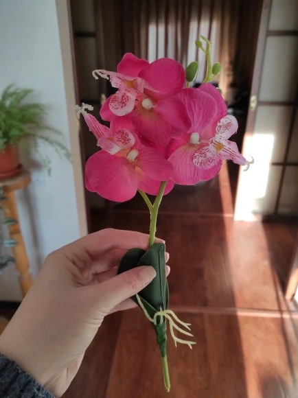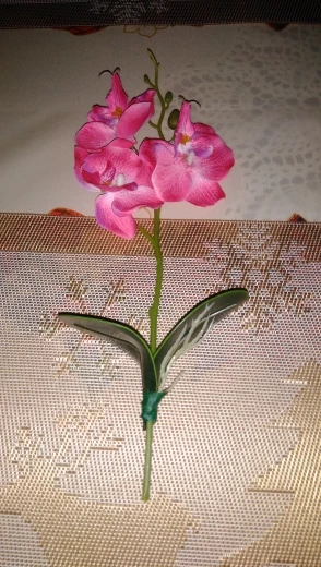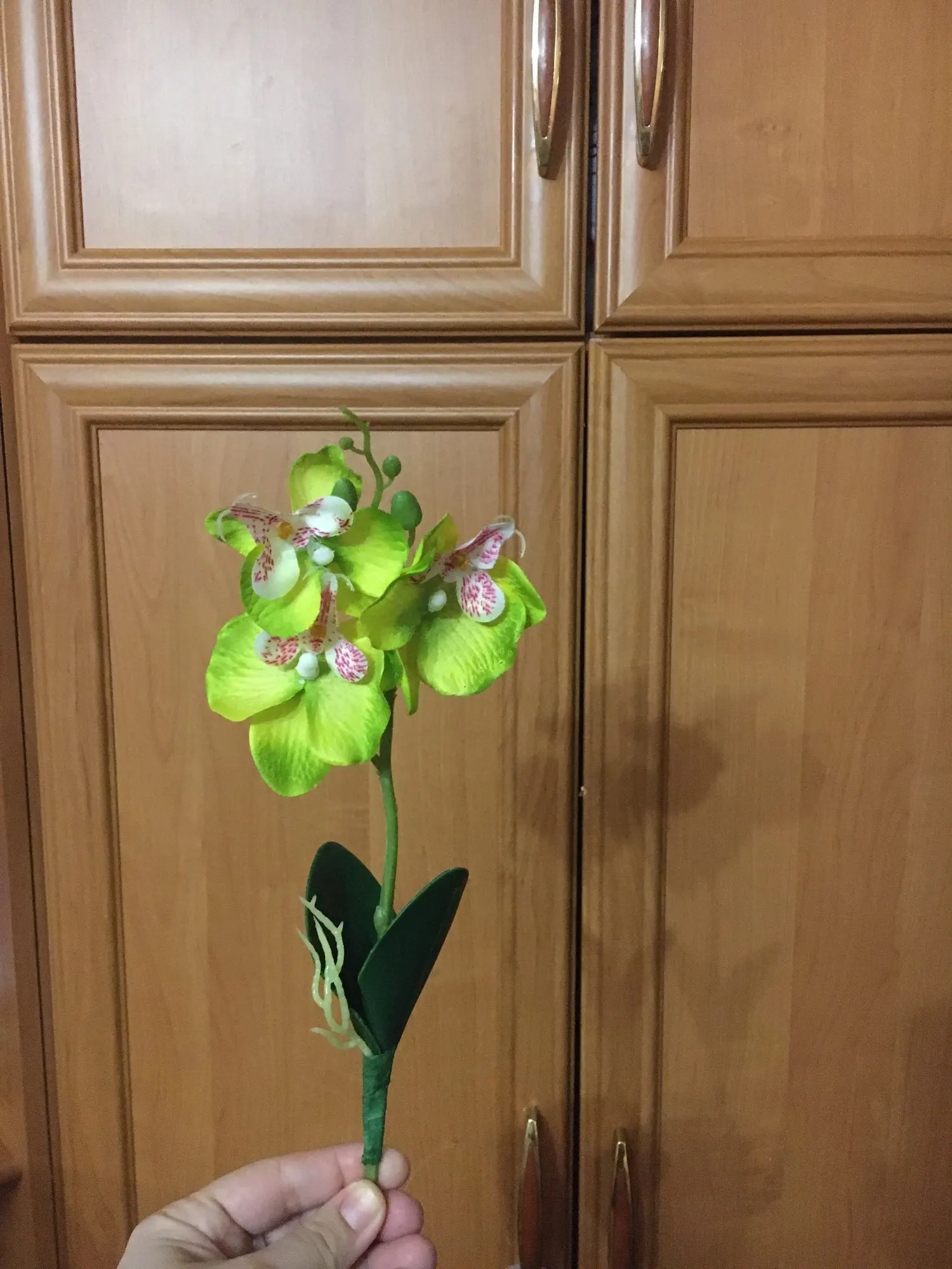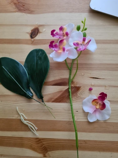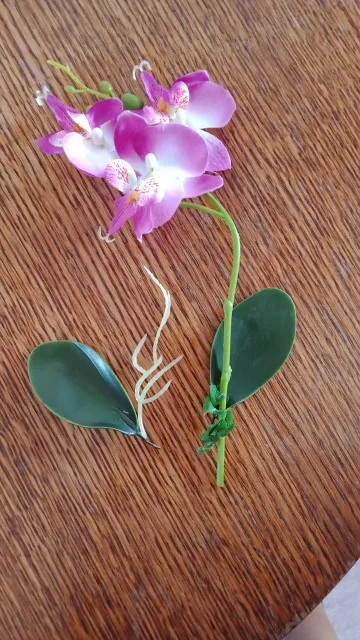 Хорошенький цветочек. Небольшой запах есть, думаю, что выветрится. Состоит из нескольких частей - отдельно 2 зелёных листа, отдельно Цветок, отдельно белые корешки. Всё прикручено зелёным скотчем или типа того - липкой ленточкой в тон листьям. Были смяты цветочки, легко расправились под горячей водой. Мне всё понравилось, спасибо!