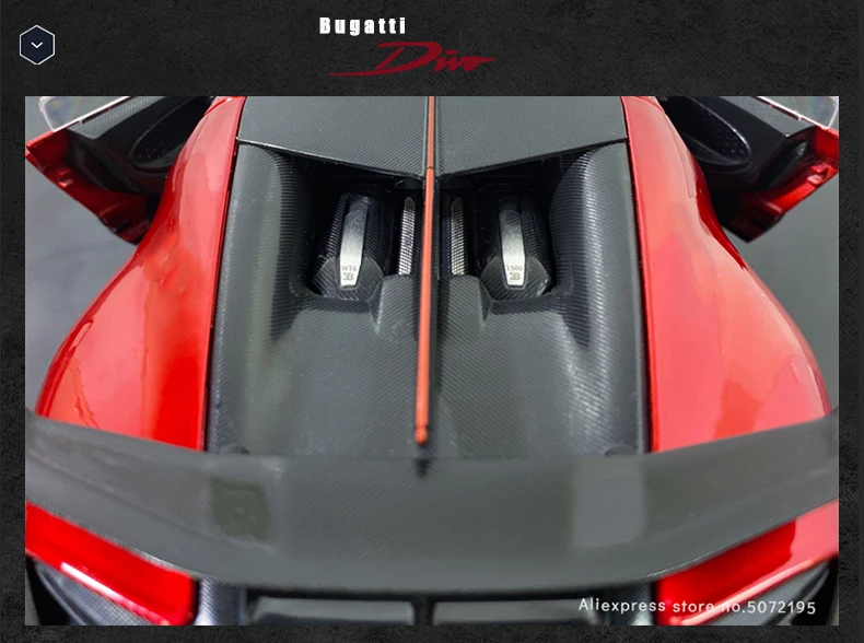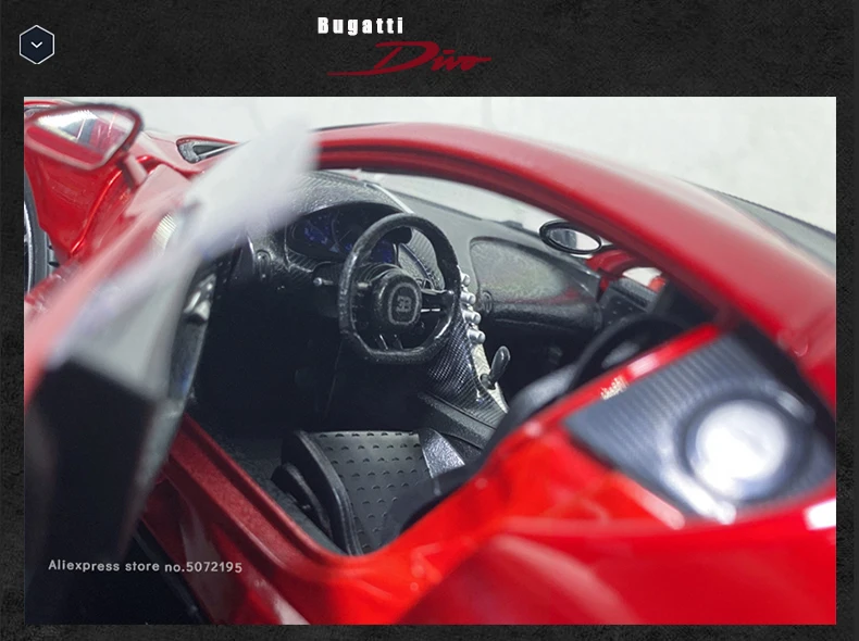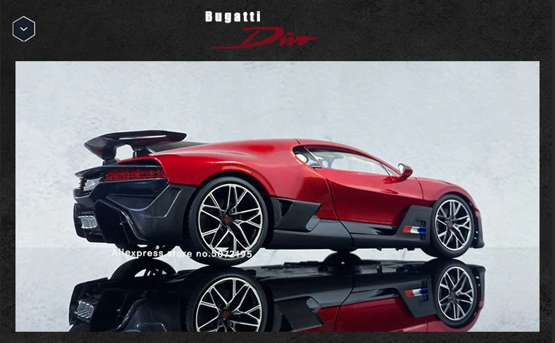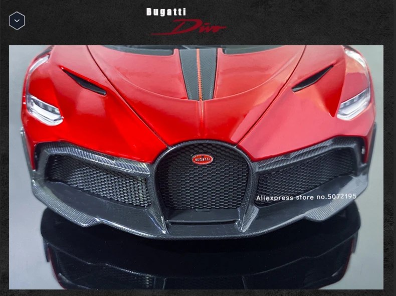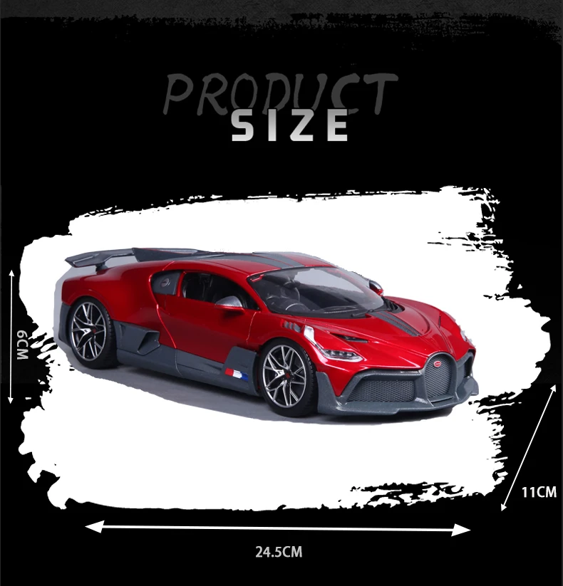 Название модели: Bugatti DivoТорговая марка: Bburago (Гонконг) Происхождение модели: КитайПропорциональная Модель: 1/18 материал модели: пластик, сплав, резинаРазмер модели: 26*11,3*6,7 см размер цветной коробки: 33*16,5*12,5 смЭтот товар представляет собой коллекционную игрушку, за исключением электричества. Шины можно перемещать, а руль двери можно перемещать.