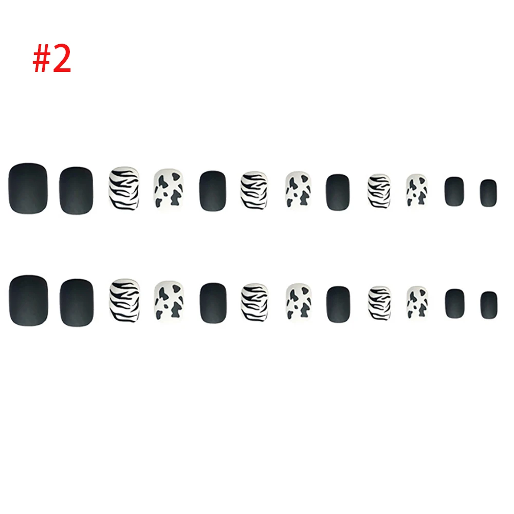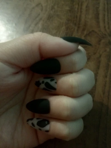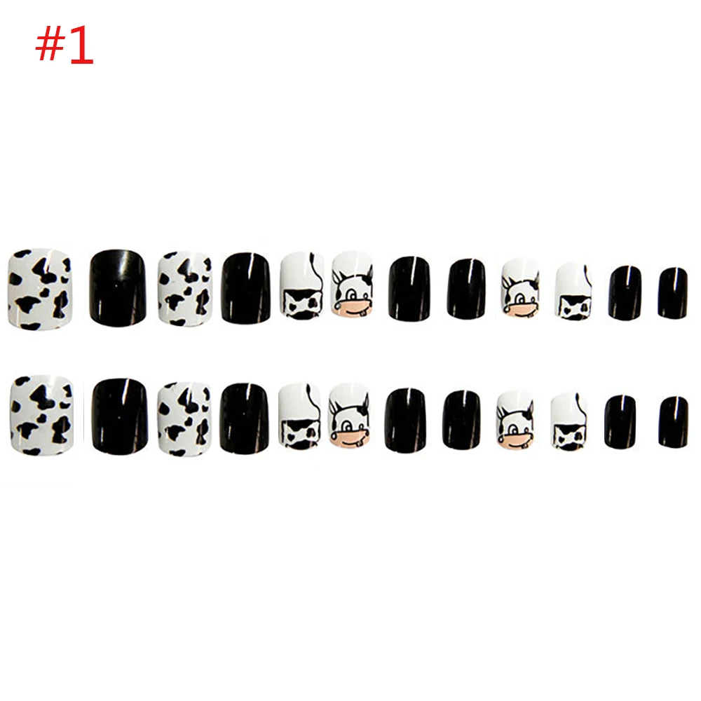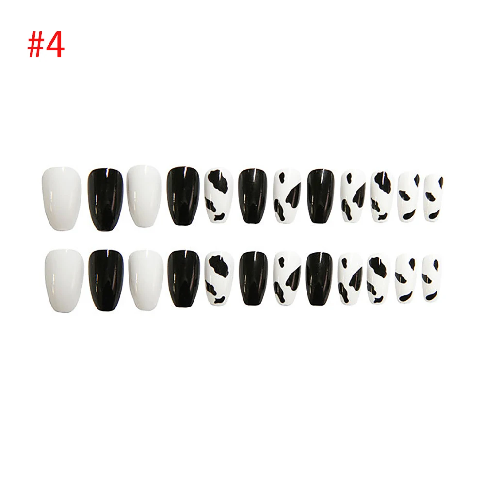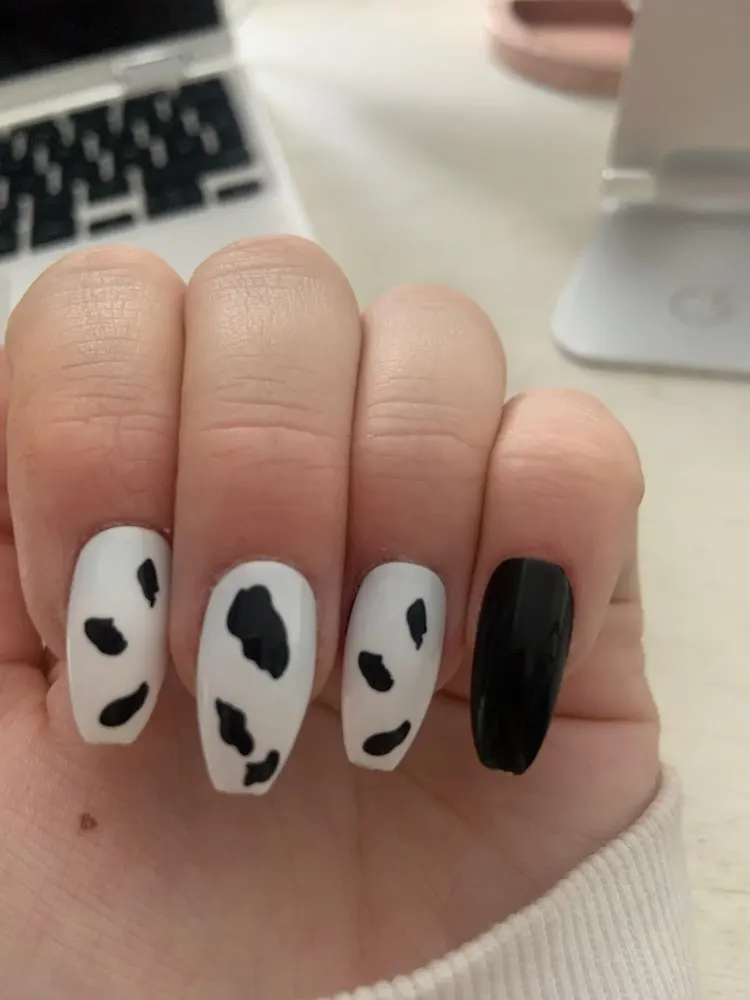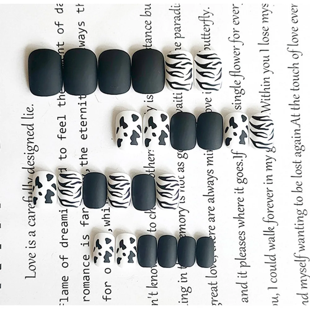 Накладные ногти, матовые, черные, белые, с принтом молочной коровы