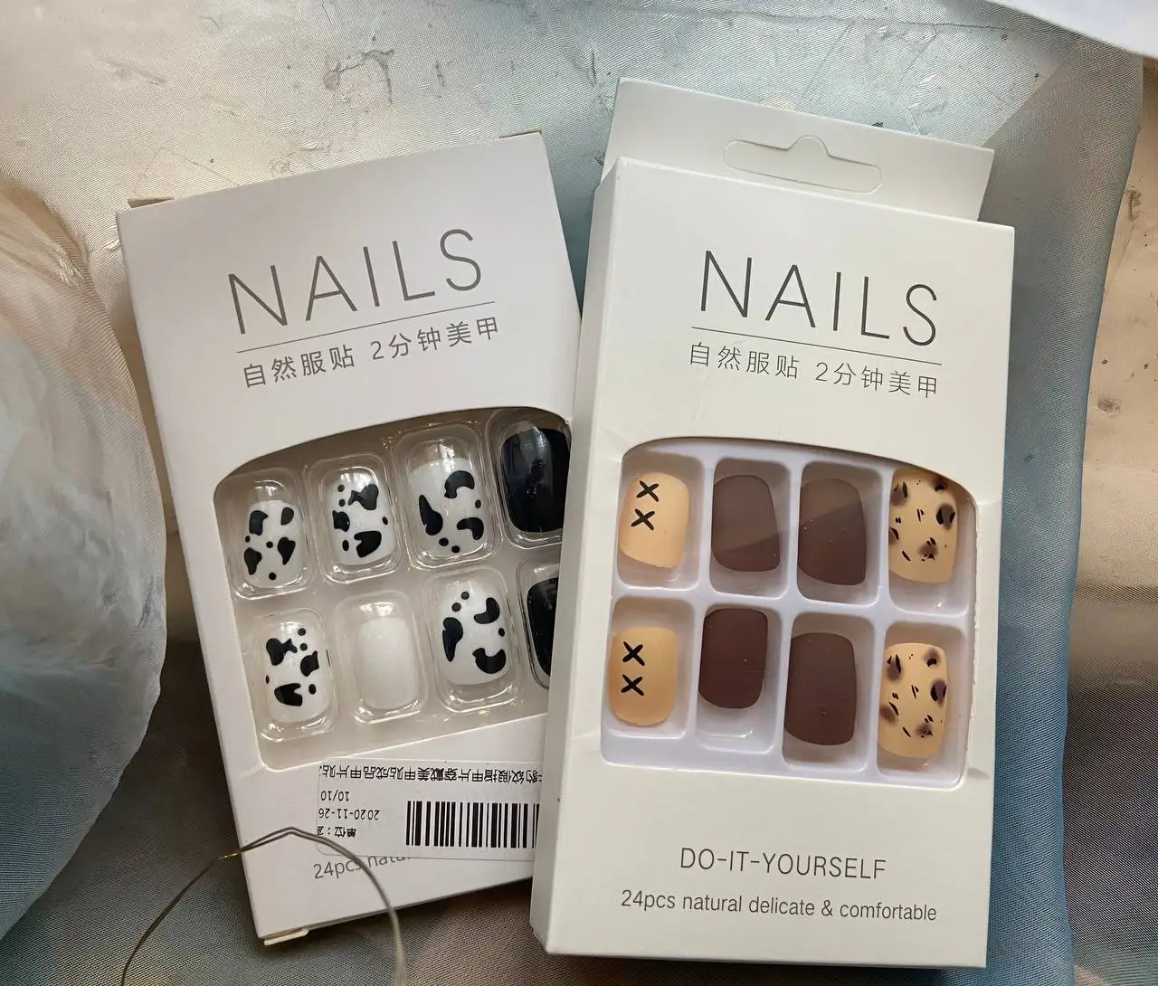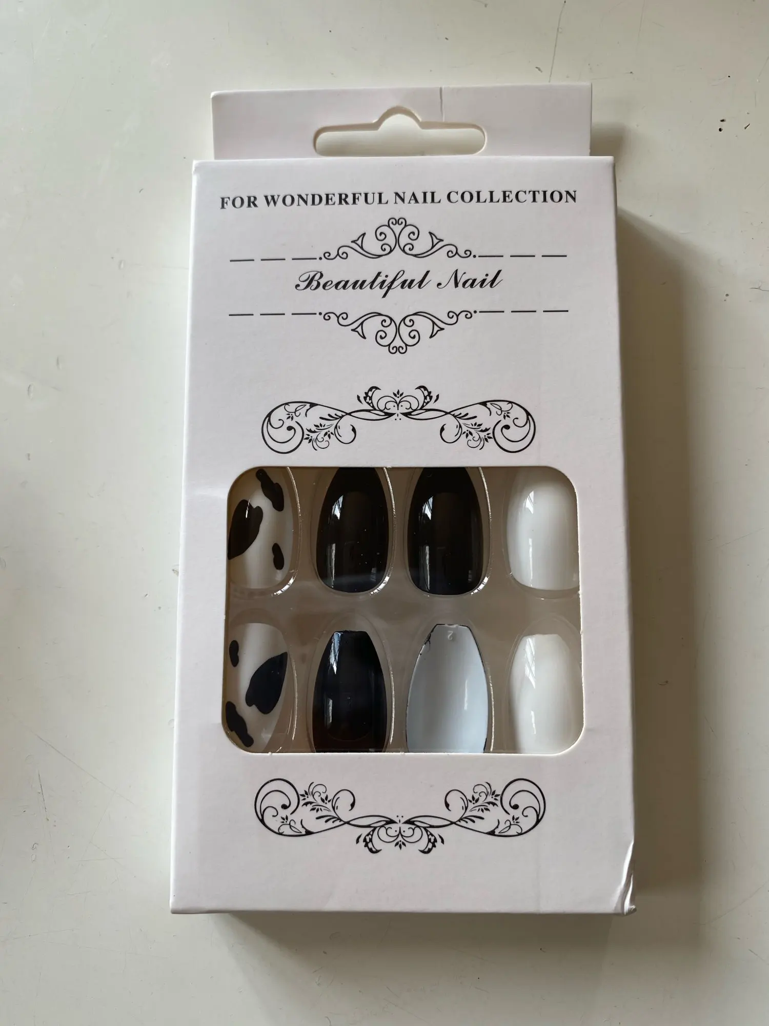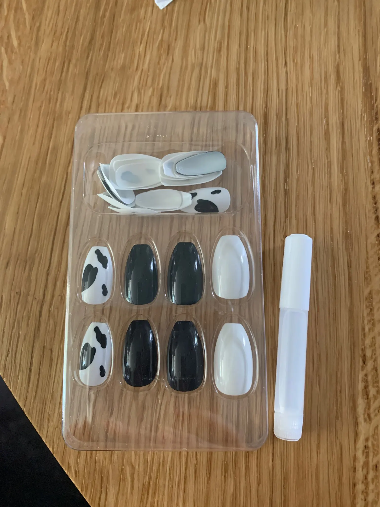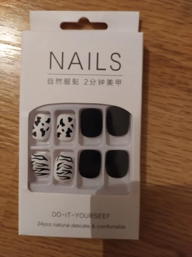 Отличный товар!, наконец-то дождалась его Шел около 2х месяцев, но я его получила, ура Буду носить с удовольствием, они безумно притягательны) С принтом коровы ногти в паре с клеем, в другой расцветке - с клеящим основанием По размеру все ногти хорошо ложатся единственное, есть подозрение, что черный цвет при носке будет стираться, ведь основание самого ногтя - белое