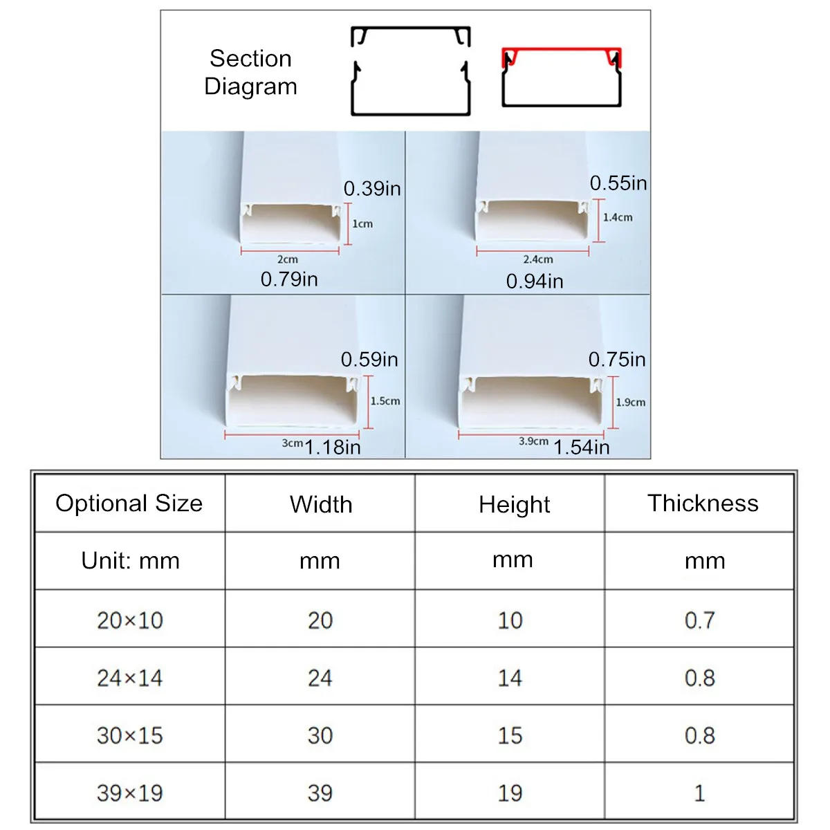Особенности товара:Материал: ПВХЦвет: белыйУстановка: самоклеящаясяОбщая длина: 5 м/16 футовКаждая длина: 1 м/39 дюймов/3 футаДополнительный размер:20x10 мм/0,79x0,39 в (удерживайте 2-4 кабель)24x14 мм/0,94x0,55 в (hold с диагональю экрана 3-6 кабель)30x15 мм/1,18x0,59 в (hold для возрастов от 4 до 8 лет кабель)39x19 мм/1,54x0,75 в (удерживайте 6-10)