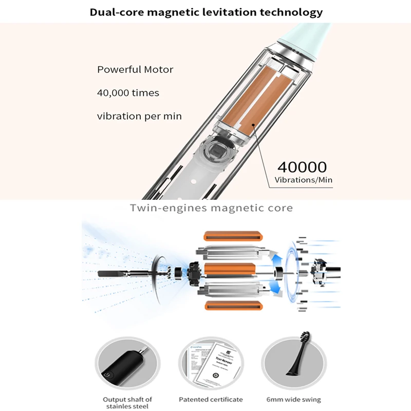 Эта Ультразвуковая электрическая зубная щетка обеспечивает 40000 микрощеток в минуту. Эффективно удаляет до 100% больше зубного налета, наслаждаясь чистыми и здоровыми зубами за 7 дней и улучшает здоровье десен и полости рта за 14 дней. Получите тщательную очистку со сниженным уровнем шума, это общее обновление по сравнению с другими электрическими зубными щетками.