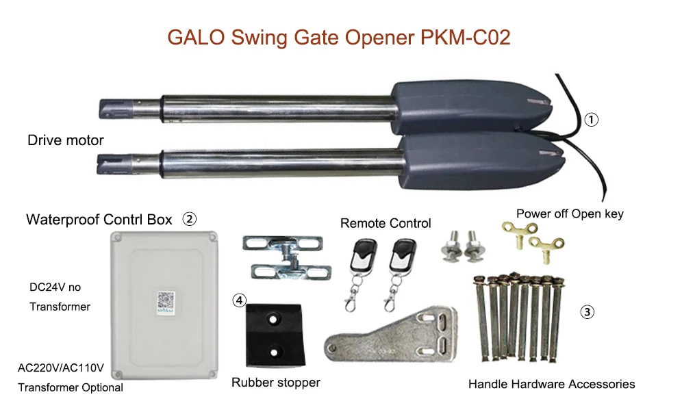① 2 открывателя для ворот (приводной двигатель) ②1 блок управления (с трансформатором) ③ 1 Набор аксессуаров для оборудования ④ 1 резиновая пробка ⑤ 2 пульта дистанционного управления ⑥ 1 руководство на английском языке дополнительные аксессуары, выберите комплект цветов, показанный на фото в некоторых странах, холодный климат, мы добавляем антифриз масла внутри двигателя, он может работать в холодной среде.