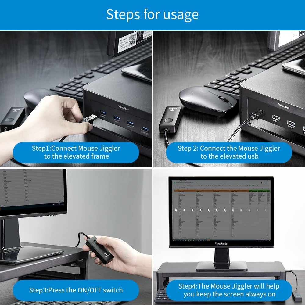 Он идеально соответствует тому, что он указывает. Вы подключаете его к USB, вы нажимаете на кнопку, и мышь движется справа слева или назад. Это здорово, чтобы избежать резервных копий и иметь возможность запустить сеанс каждый раз, когда компьютер заблокирован.