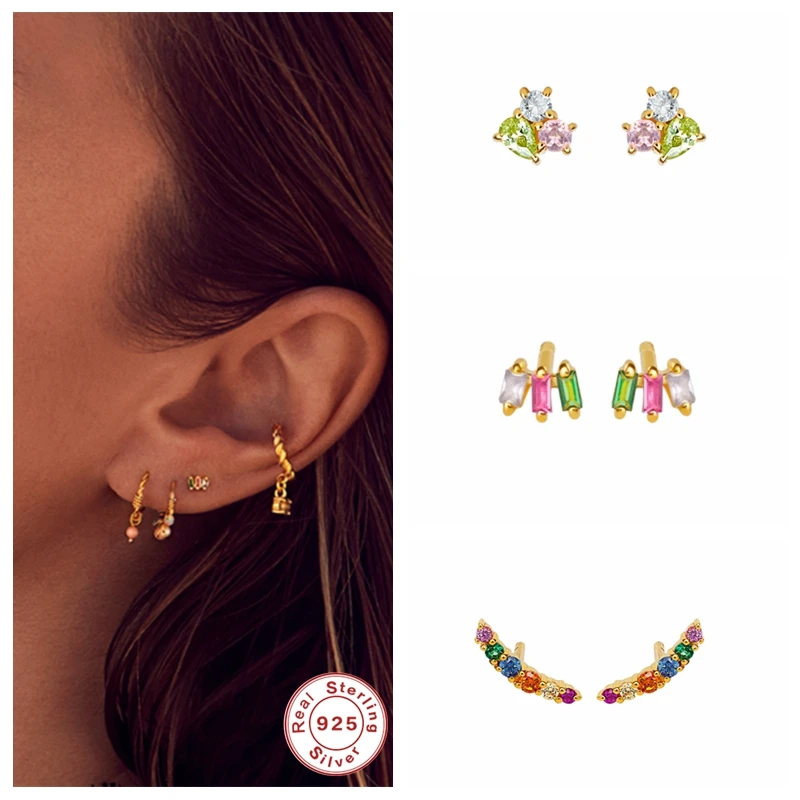925 пробы серебро Корейский серьги Радуга Циркон из нержавеющей стали, женские серьги-гвоздики для пары влюбленных Bling CZ серьги, ювелирные изделия