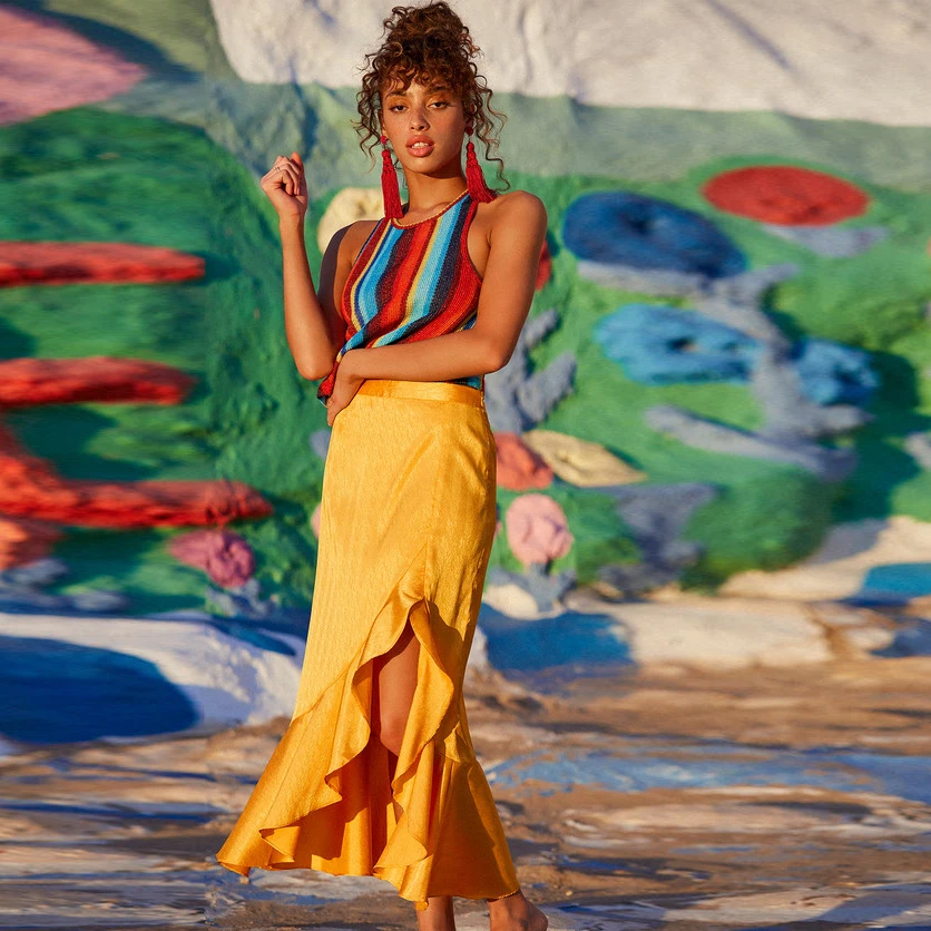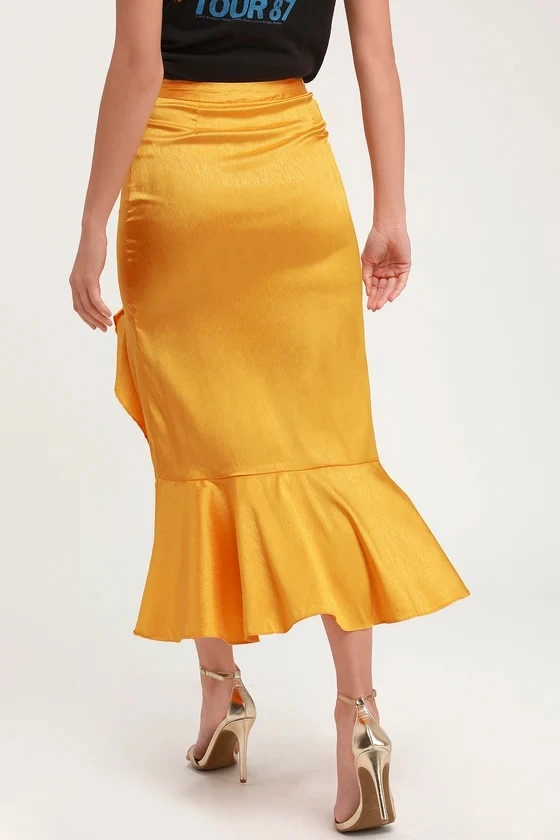 Женская атласная юбка с рюшами, ассиметричная юбка до середины икры, на молнии