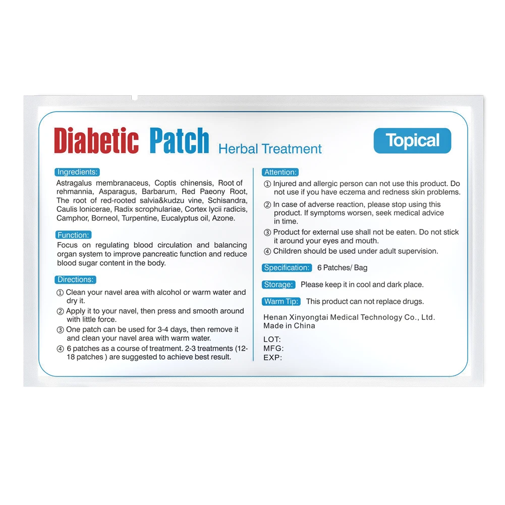 [Ингредиенты] astragalus membranaceus, Coptis chinensis, корень rehmannia, Asparagus, Barbarum, Red Paeony Root, корень красно-укорененной salvia & kudzu vine, Schisandra, Caulis roradiae, кортекс lycii radicis, Camphor, Borneol, Turpentine, Eucalyptus oil, Azone. 【 Функция 】фокусировка на регулировании кровообращения и балансировке органов для улучшения функции поджелудочной системы и снижения уровня сахара в крови в организме. 【Direction】только для внешнего использования. 1. Очистите пупок спиртом или водой и высушите. 2. Нанесите на пупок, аккуратно нажмите и гладко. 3. Один патч используется для 3-4 дней. 4,6 патчи в ходе лечения, 2-3 лечения (12-18 патчей) предлагается для достижения наилучшего результата.