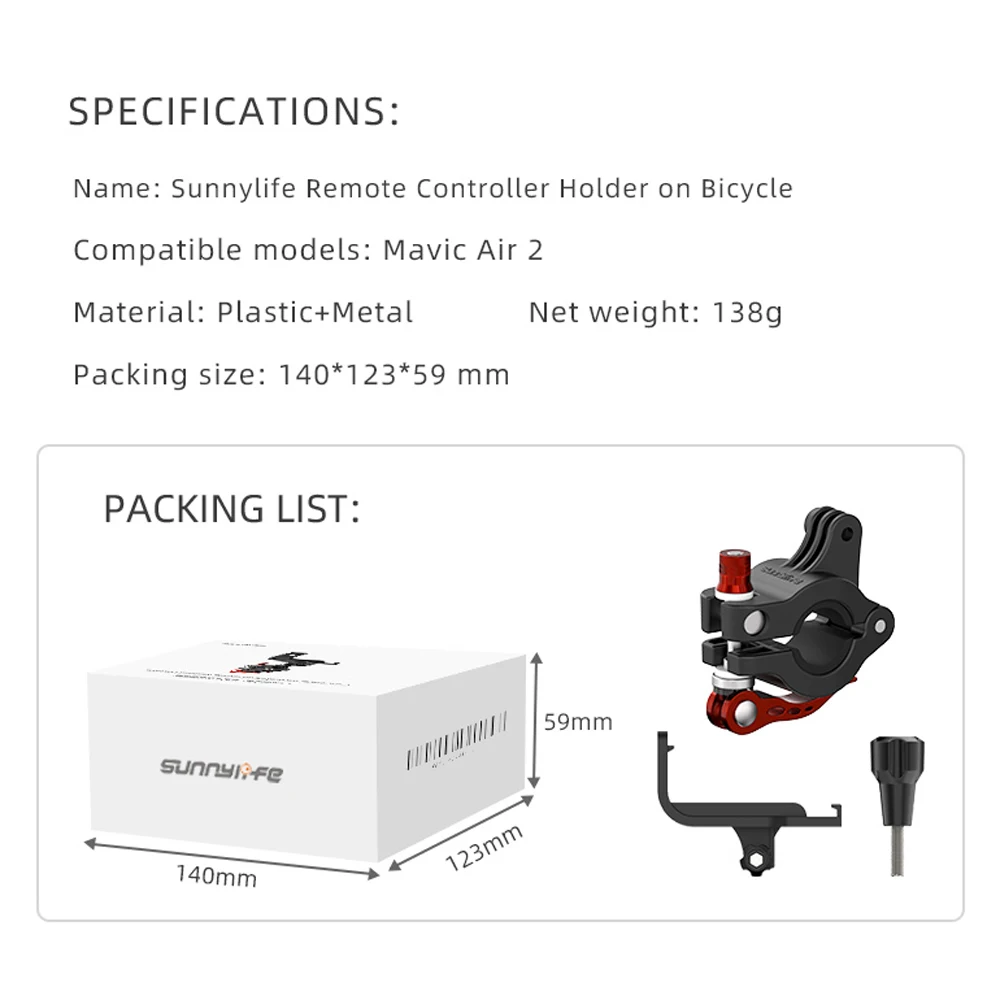 Дрон пульт дистанционного управления кронштейн для велосипеда подставка для DJI Mavic Air 2 велосипедный Руль держатель креплениеХарактеристика:1. Держатель для велосипеда с дистанционным управлением, используется для DJI Mavic Air 2.2. Во время езды и съемки в дикой природе вы можете зафиксировать пульт дистанционного управления на велосипеде и управлять пультом дистанционного управления во время езды.3. Специально разработан для дистанционного управления DJI Mavic Air 2, плотно зажимается и не легко ослабляется.4. Отверстие для USB-C закрыто, и пульт дистанционного управления можно заряжать, не снимая кронштейн.Спецификация:Материал: пластик + металлЦвет: черныйРазмер упаковки: 140X123X59 мм/5,51X4,84X2,32"Подходящая модель: для Mavic Air 2Примечание:1. Из-за различных настроек монитора и светильник эффект, фактический цвет элемента может быть s светильник ly отличается от цвета, представленного на снимках. Спасибо!2. Возможны отклонения в 1-3 мм вследствие измерений вручную.