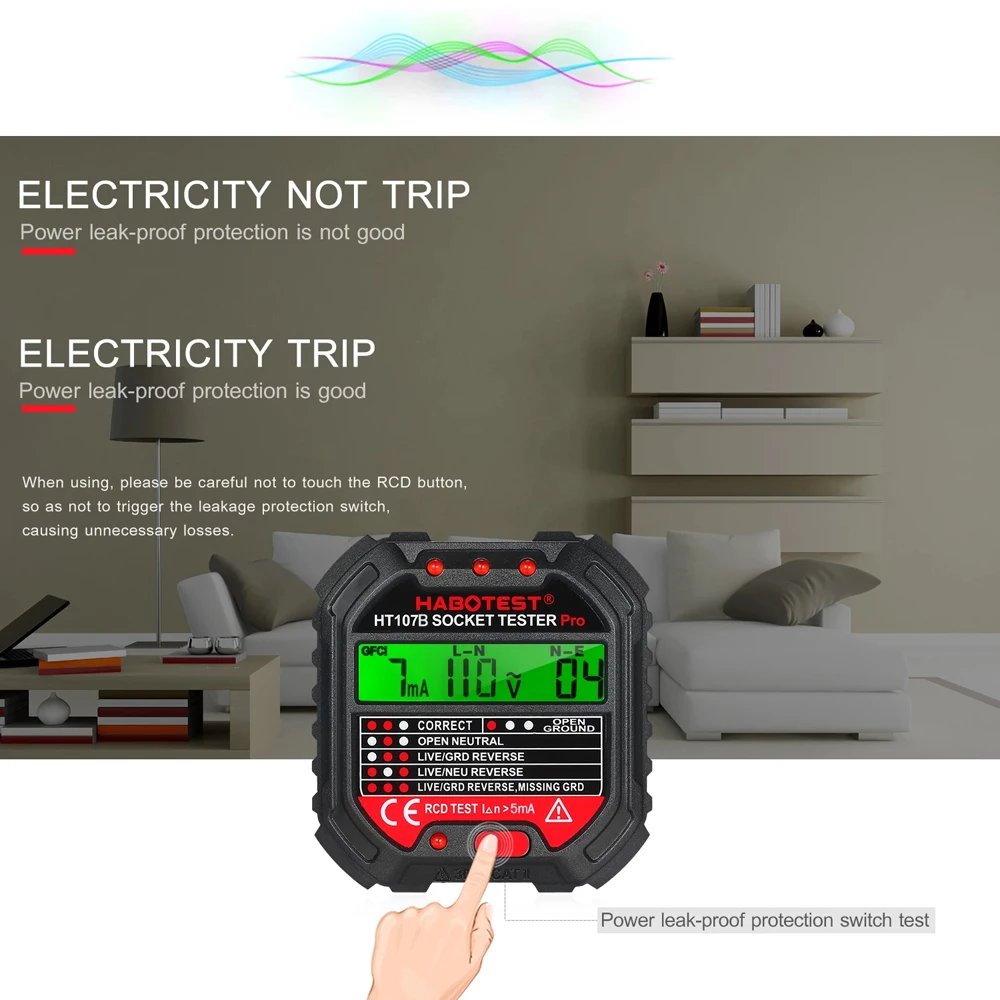 Особенности: Портативный тестер электрических розеток --- Расширенный тестер розеток для быстрого обнаружения правильного или нет подключения к розетке. Компактный размер, легкий и удобный в использовании. С ЖК-дисплеем с подсветкой напряжения для тестирования напряжения. PLUG & PLAY --- разработан с помощью кнопки тестирования RCD/GFCI, один клик, чтобы узнать рабочее состояние протектора утечки. Идеально подходит для защиты вашей безопасности от риска поражения электрическим током. Яркий светодиодный дисплей --- светодиодный светильник на задней панели устройства. Красный светодиодный индикаторы может быть светильник четко даже в прямыми солнечными лучами светильник также использоваться в темное время суток, делает вас прочитать это быстро. 6 моделей светодиодный светильник --- с 6 легко читаемыми индикаторами, чтобы указать состояние розетки, легко определить: правильный, открытый, открытый, нейтральный, живой/нейтральный, live/Ground Reverse, Live/Ground Reverse, отсутствует земля. Широкое применение-широко используется для тестирования электрического обслуживания, тестирования офисных розеток, тестирования силовых полосок и тестирования настенных розеток в школе, лаборатории, фабрике и других социальных областях. Приемка и проверка безопасности дома, это экономит вам много времени при тестировании проблем с розетками. Спецификация: Цвет: черный Модель: HT107B (США)/HT107D (ЕС)/HT107E (Великобритания)(Опционально) Материал: Огнестойкий АБС-пластик Рабочее напряжение: 90 ~ 250 В/45 ~ 65 Гц Фазовое напряжение: 90 ~ 250 В/45 ~ 65 Гц Напряжение утечки: 0 ~ 99 в/45 ~ 65 Гц Точность: ± (2.0% + 2) Тест на Код: >30 мА (штепсельная вилка ЕС/Великобритании) Рабочее напряжение cd: 220 В ± 20 в GFCI тест: >5 мА (штепсельная вилка США) Рабочее напряжение GFCI: 110 В ± 20 в Рабочая среда: 0 ℃ ~ 40 ℃, 20% ~ 75% RH Среда хранения: -10 ℃ ~ 50 ℃, 20% ~ 80% RH Размер изделия: 68*65*60 мм/2,7*2,6 * 2.4in Товар Вес: 74g/2,6 oz