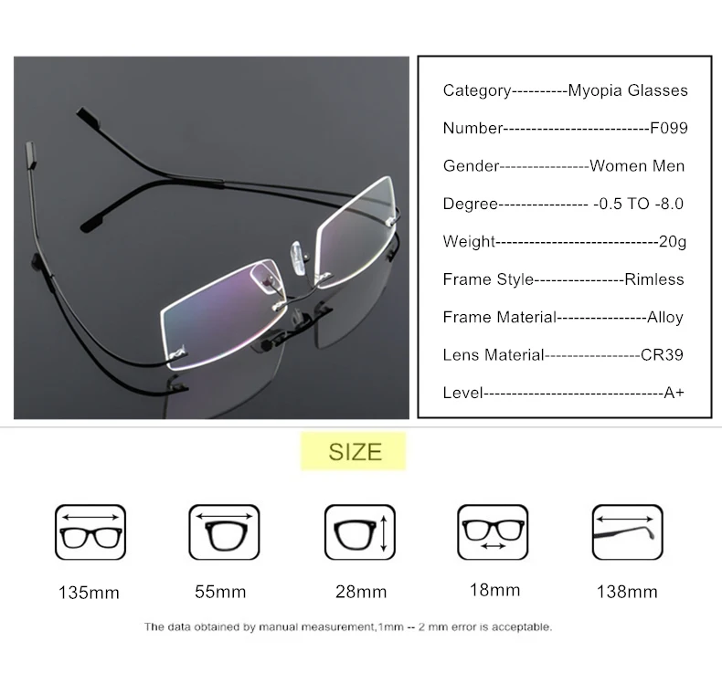 Унисекс, модель F093, без оправы, Рецептурные очки для близоруких-0...