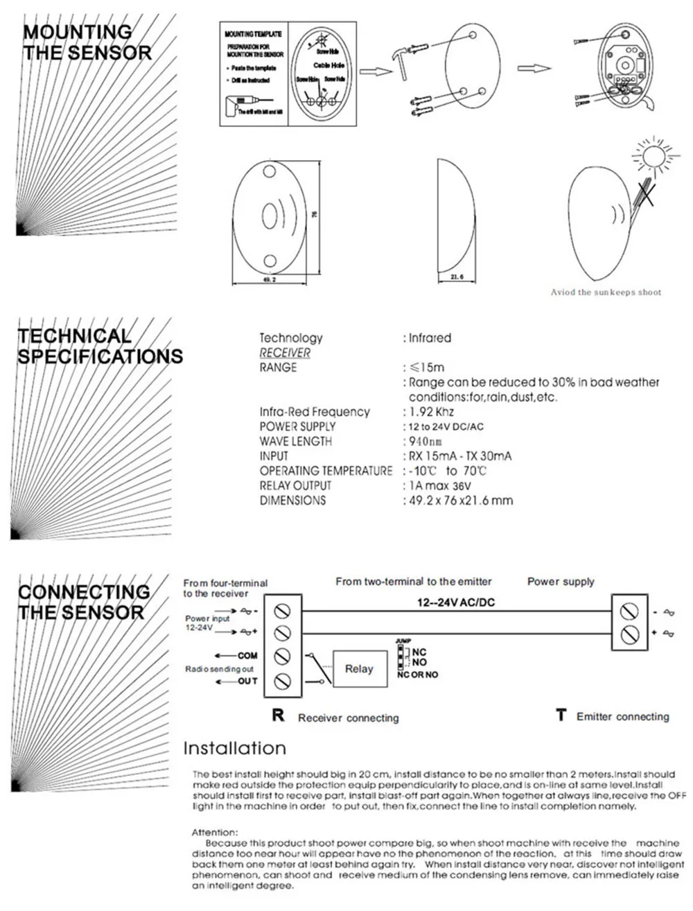 Продукт должен быть вертикальным при установке и убедитесь, что передатчик и приемник находятся на одном уровне.