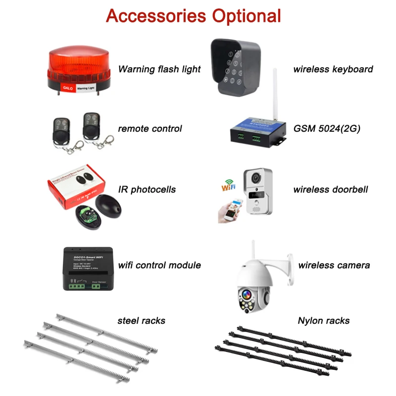 1. Полностью интегрированная электрическая механическая система (количество стоек опционально). 2. Интерфейс платы управления для дополнительных ударопрочных инфракрасных фотоэлементов. 3. Можно подключить мигасветильник, клавиатуру, электрический замок и так далее. 4. Автоматическое Отложенное закрытие. 5. Регулируемая чувствительность сопротивления. 6. Автоматическая остановка ворот и повторное открытие при столкновении с препятствием. 7. Беспроводной пульт дистанционного управления или проводной пульт дистанционного управления являются дополнительными. 8. Открыватель раздвижных ворот 24 В постоянного тока может подключать трансформатор и резервную батарею.