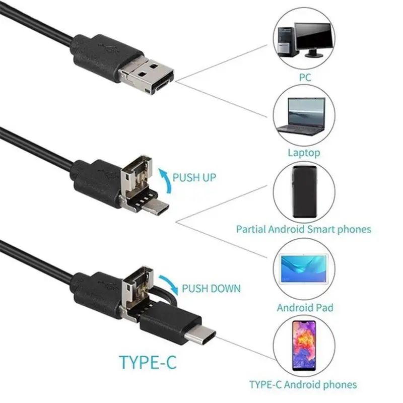 6 высокой яркости светодиодный свет регулируются (подгоняются под полностью закрытом состоянии). Камера HD coms. Спецификация длины линии (2 метра). Уровень водонепроницаемости: IP67. Разрешение: 5,5/7,0 мм объектив 640*480. Интерфейс Android, распределительный usb-кабель-адаптер. Номер кадра: 30 кадров в секунду. Эффективное фокусное расстояние: 3-10 см. Спецификация Светодиодный usb-эндоскоп Type6 Цвет черный Линия Длина: 1m/2m/3,5 m 3-в-1 конвертер TYPE-C/Mirco/USB Стиль: мягкая линия Посылка включает в себя 1x3 в 1 промышленный эндоскоп 1 х боковое зеркало 1 х крючок 1 х Магнит 1 x Руководство пользователя