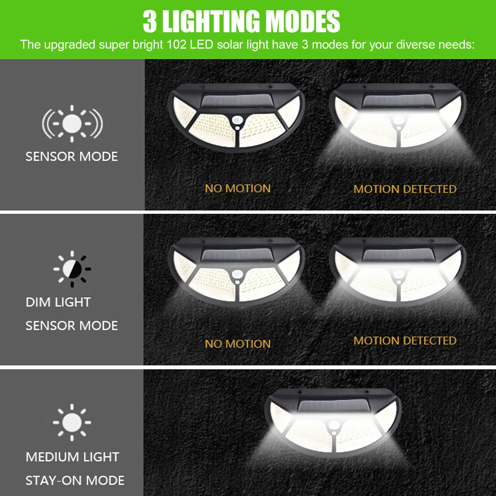 -3 режима крепления на светильник: Модернизированный супер яркий светодиодный светильник 102 на солнечной батарее имеет 3 режима для ваших разнообразных потребностей: ① режим тусклый светильник, ② тусклый светильник + сильный светильник с датчиком, ③ мощный светильник с датчиком.