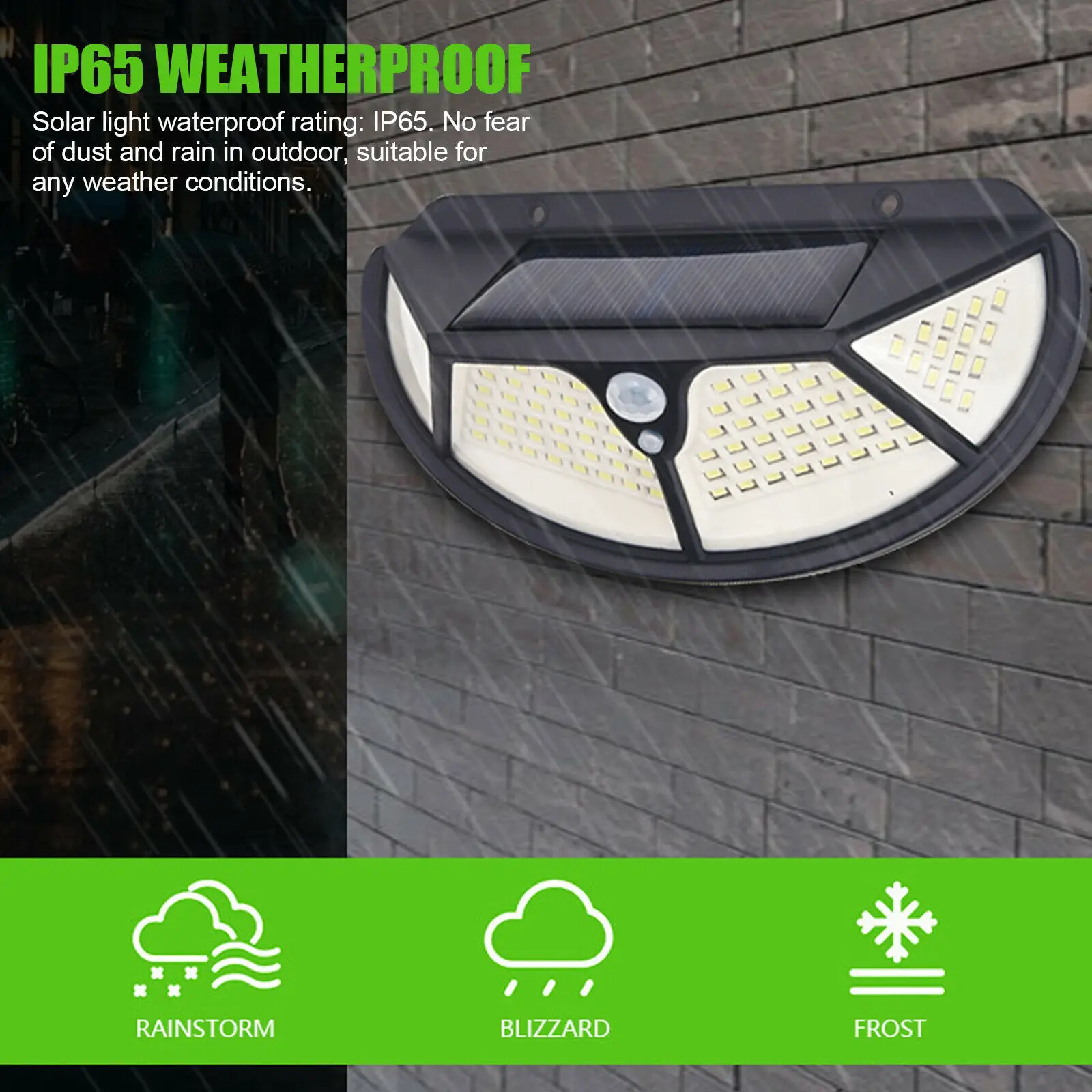 -Степень защиты от атмосферных воздействий IP65: водонепроницаемый светильник на солнечной батарее: IP65. Не бойтесь пыли и дождя на улице, подходит для любых погодных условий.