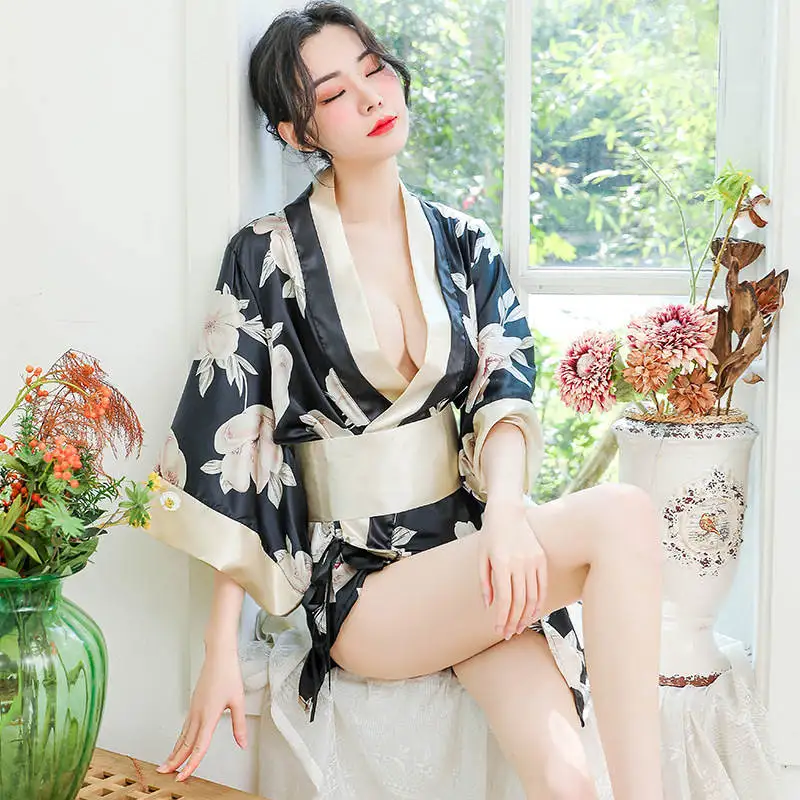Пикантное нижнее белье в японском стиле, сатиновое изысканное пижамное кимоно с принтом и большими широкими рукавами-бабочками, комплект соблазнительной формы, новинка 2020