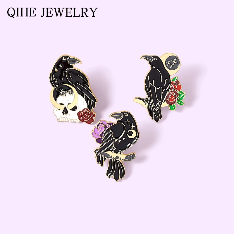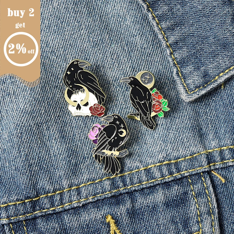 Готический Ворон эмали штырь Пользовательские Птица Череп Луны цветы мешочек для брошек штырь отворотом в стиле панк со значком, ювелирное изделие в подарок для друзей оптом