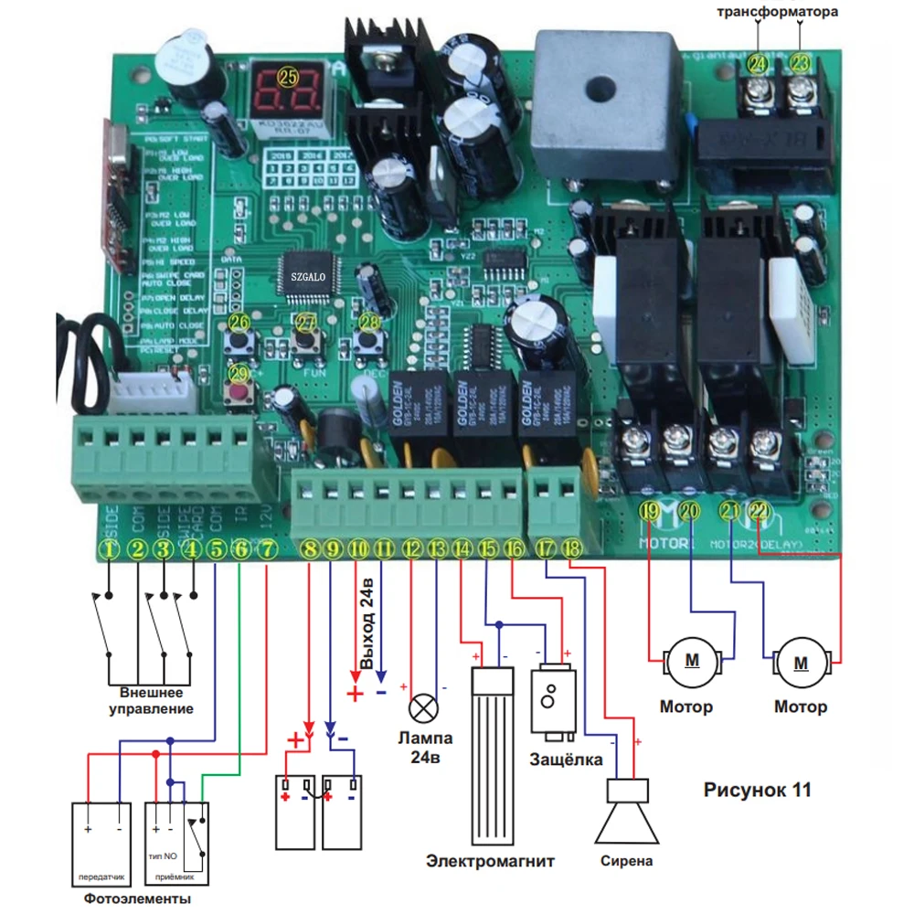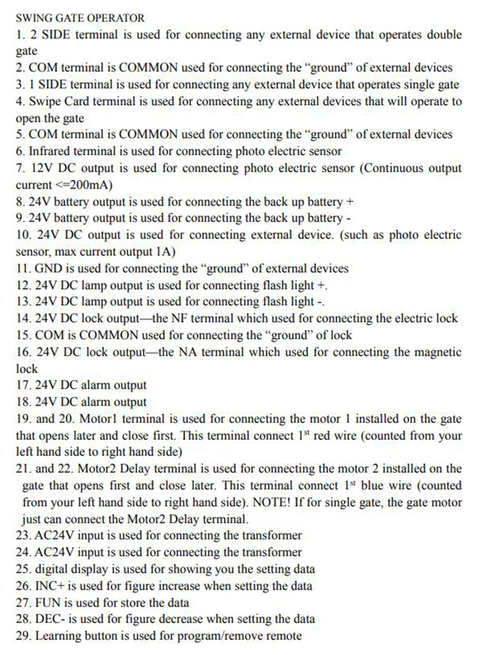 1. 2 боковых терминала используются для подключения любого внешнего устройства, которое работает с двойными воротами2. Com-терминал широко используется для подключения заземления ”внешних устройств3. 1 боковой Терминал используется для подключения любого внешнего устройства, которое работает с одним затвором4. Терминал карты салфетки используется для подключения любых внешних устройств, которые будут работать, чтобы открыть ворота5. Com-терминал широко используется для подключения заземления ”внешних устройств6. Инфракрасный Терминал используется для подключения фото электрического датчика7. Выход постоянного тока 12 В используется для подключения фотоэлектрического датчика (непрерывный выходной ток <= 200 мА)8. Выход батареи 24 В используется для подключения резервного аккумулятора +9. Выход батареи 24 В используется для подключения резервного аккумулятора-10. Выход постоянного тока 24 В используется для подключения внешнего устройства. (например, фотоэлектрический датчик, максимальный выходной ток 1A)11. GND используется для подключения заземления ”внешних устройств12. Выход лампы постоянного тока 24 В используется для подключения вспышки светильник +.13. Выход лампы постоянного тока 24 В используется для подключения флэш-светильник-.14. Выход замка постоянного тока 24 В-терминал NF, который используется для подключения электрического замка15. COM широко используется для подключения земли ”замка16. Выход блокировки постоянного тока 24 В-терминал NA, который используется для подключения магнитного замка17. 24V DC выходной сигнал тревоги18. 24V DC выходной сигнал тревоги19. И 20. Терминал Motor1 используется для подключения двигателя 1, установленного на воротах, который открывается позже и закрывается сначала. Этот терминал подключает 1-й Красный провод (отсчитывается с левой стороны на правую сторону)21. И 22. Терминал задержки двигателя 2 используется для подключения двигателя 2, установленного на воротах, которые открываются сначала и закрываются позже. Этот терминал подключает 1-й синий провод (отсчитывается с левой стороны на правую сторону). Примечание! Если для одиночных ворот, двигатель ворот просто может подключить терминал задержки двигателя 2.23. AC24V вход используется для подключения трансформатора24. AC24V вход используется для подключения трансформатора25. Цифровой дисплей используется для отображения данных настройки26. INC + используется для увеличения фигуры при установке данных27. Забава используется для хранения данных28. DEC-используется для уменьшения фигуры при установке данных29. Кнопка обучения используется для программы/удаленного удаления