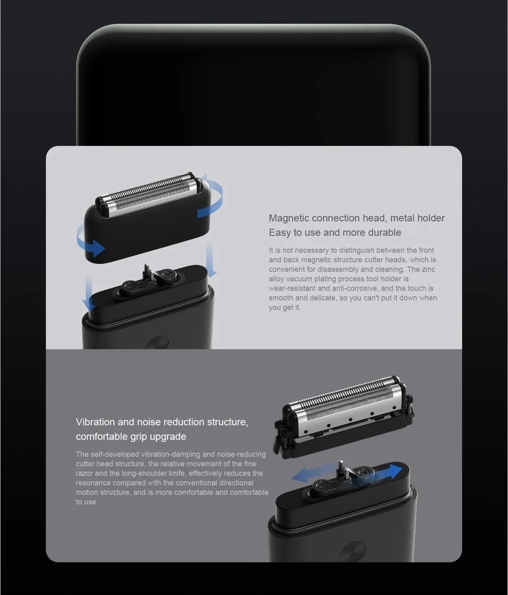 Плавающий двойной ножДуговой длинный нож, ультратонкая тонкая БритваВодонепроницаемый корпусIPX7 водонепроницаемое, влажное и сухое двойное БритьеМагнитный держатель ножаДержатель инструмента из цинкового сплава, магнитное соединениеЛегкий и портативныйДизайн карты, маленький и тонкийИнтерфейс общего назначенияЗарядка Type-C, 1h полнаяВысокоскоростной двигательМощное, эффективное БритьеПростое и стильное, нежное БритьеОсвежающее и чистое лицо сделает вас уверенными каждый день. Высококачественная, портативная и простая в использовании бритва стоит лошади.Двойной возвратно-поступательный нож Mijia небольшой и простой, с усовершенствованной и эффективной системой двойного ножа и мытьем тела. Это изысканный компаньон.