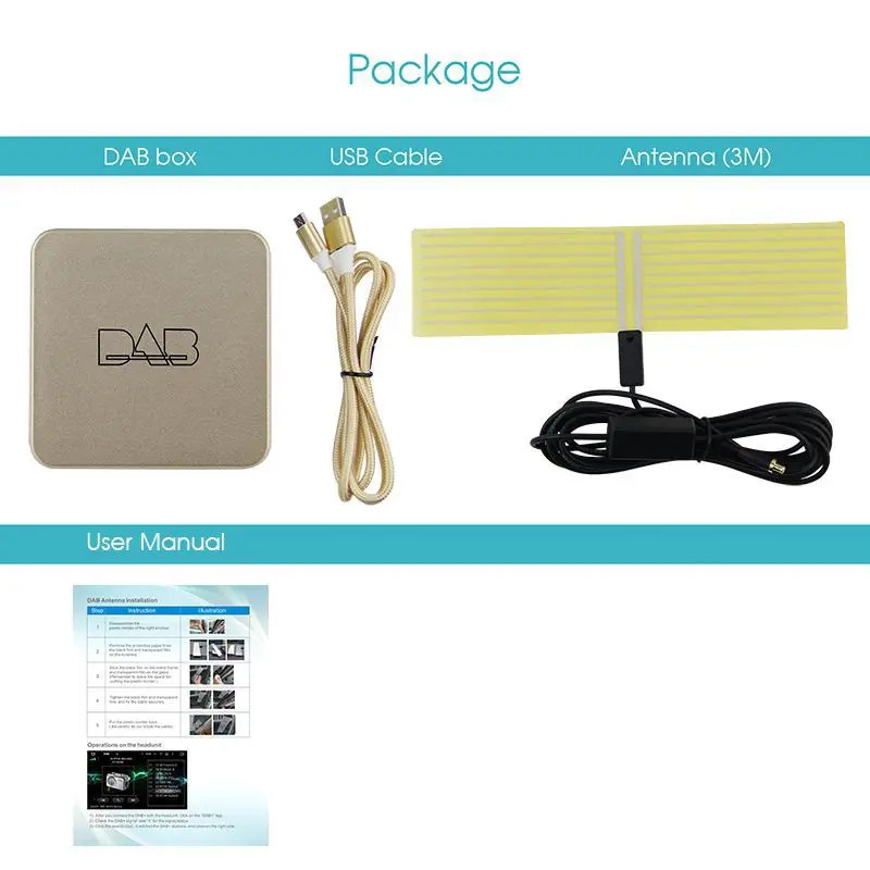 Подходит для автомобильного аудио, совместимого с DAB Usb-порт, подходит для большинства автомобильных аудиосистем android Высокочувствительная приемная антенна, Стабильный прием и высокий уровень шума сигнала. Стерео выход, качество класса 5 в низкое напряжение питания, низкое потребление Маленький размер и простота установки Рабочая температура: -20 ℃ ~ + 70 ℃ Источник питания: 5 В Частотный диапазон: 174-240 МГц Разделение канала: 55 дБ Разница в канале: +/-3 дБ Входное сопротивление: 50 Ом Вес брутто: 150 г